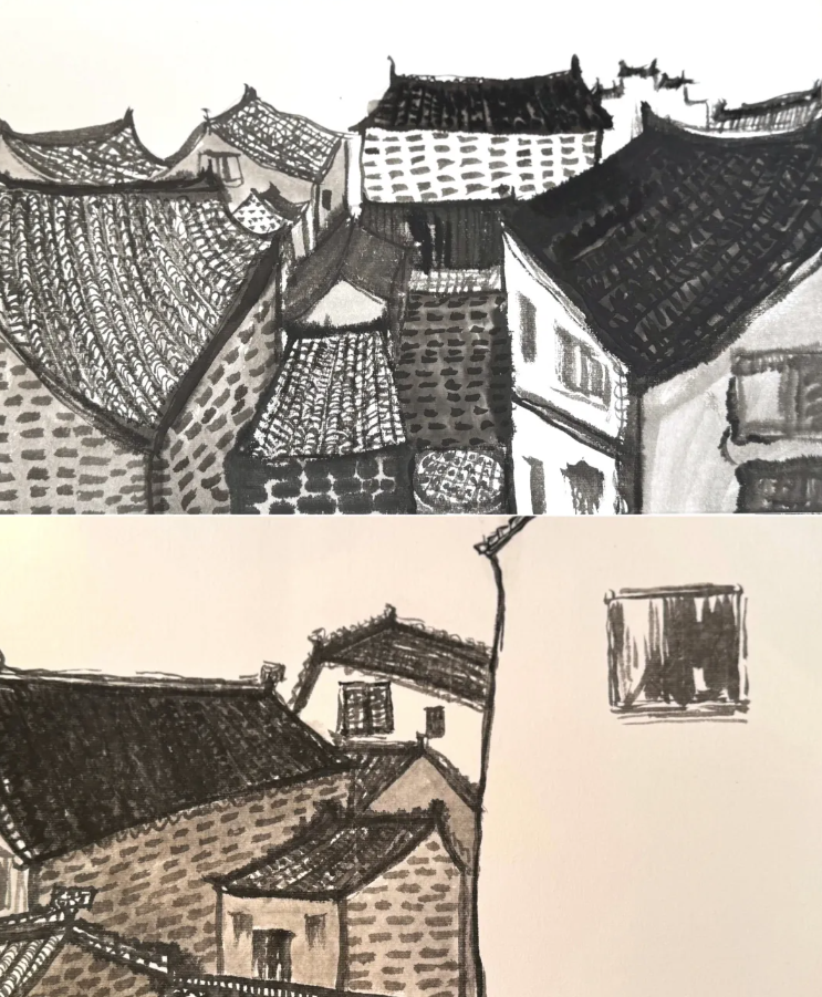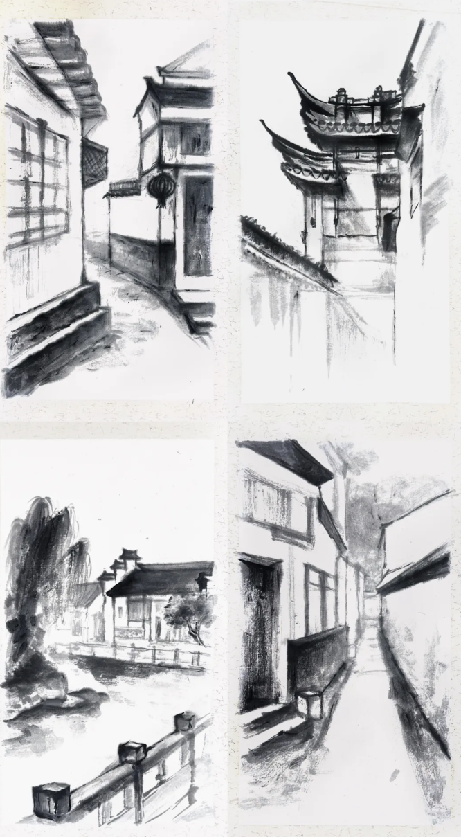 陆巷依山临湖,古巷幽深,白墙黛瓦间保留着浓厚的传统风貌。面对真实的自然与人文环境,同学们认真观察、积极创作,在实践中锻炼观察能力和表现能力。