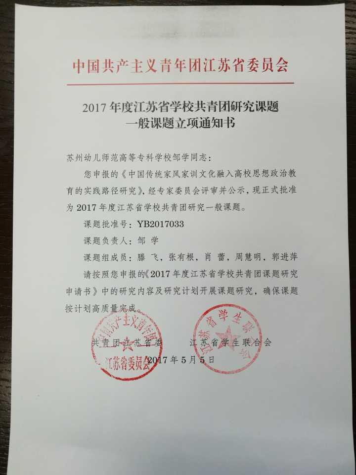近日,共青团江苏省委、江苏省学生联合会下发了《关于公布2017年度江苏省学校共青团研究课题立项结果的通知》(团苏委联〔2017〕8号),我校学前一系邹学老师申报的课题《中国传统家风家训文化融入高校思想政治教育的实践路径研究》获得一般课题立项(立项编号:YB2017033)。
