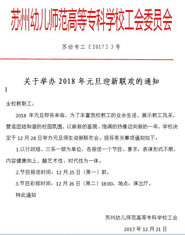 苏幼专工〔2017〕3号关于举办2018年元旦迎新联欢的通知