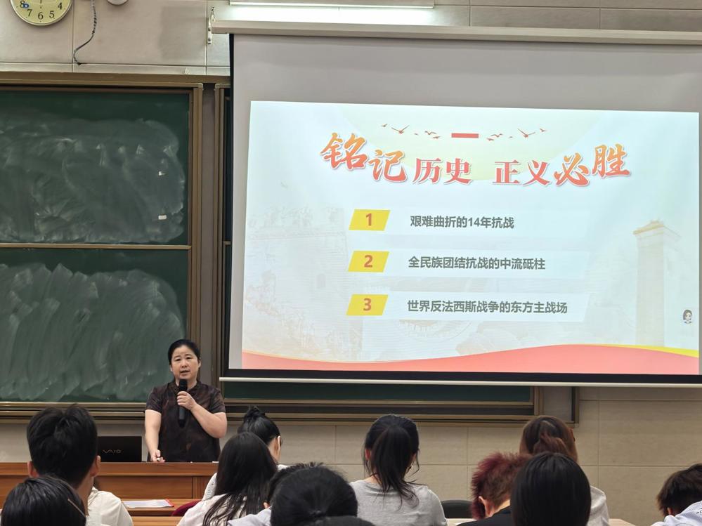 专题思政课以“中国人民抗日战争暨世界反法西斯战争胜利 80周年”为时代背景,结合大量的历史影像与数据图表,用清晰时间轴带领师生重温了“艰难曲折的14年抗战”历程,深入阐释中国共产党在全民族团结抗战中的中流砥柱作用,并立足国际视野,彰显中国作为东方主战场的重要贡献。课程内容明确了抗日战争洗刷民族耻辱、重新确立中国大国地位、开辟中华民族伟大复兴光明前景的重要意义,同时阐明爱国情怀、民族气节、英雄气概、必胜信念的精神丰碑,永不磨灭。最后校党委委员、副校长吕虹强调,全体师生需珍爱和平,践行全球安全倡议、推动构建人类命运共同体、维护战后国际秩序,以史为鉴、开创未来,埋头苦干、勇毅前行,努力在新时代新征程上赢得更加伟大的胜利和荣光。