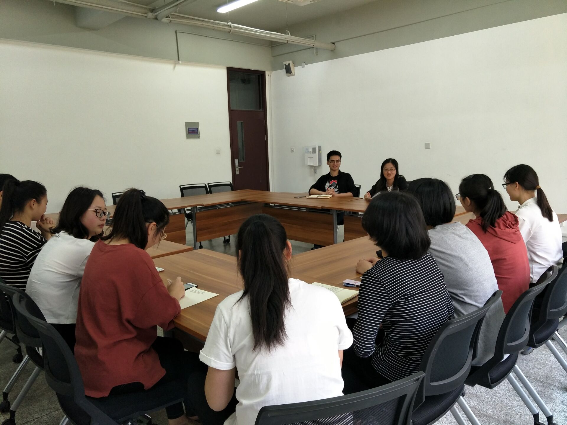 最后两位老师总结:大学的教学模式,其目的在于开阔自己的视野,同学们应该在教师引导下逐步进行自主学习,选择适合自己的学习方法,调整高中以来的固有学习习惯,去适应大学的扩散型教育方法。另外,同学们还应该多与老师进行互动,勇于提出自己的想法。不要产生消极情绪,要尽量去适应老师。 技能课的练习时间要合理安排,保质保量完成每周还课任务。
