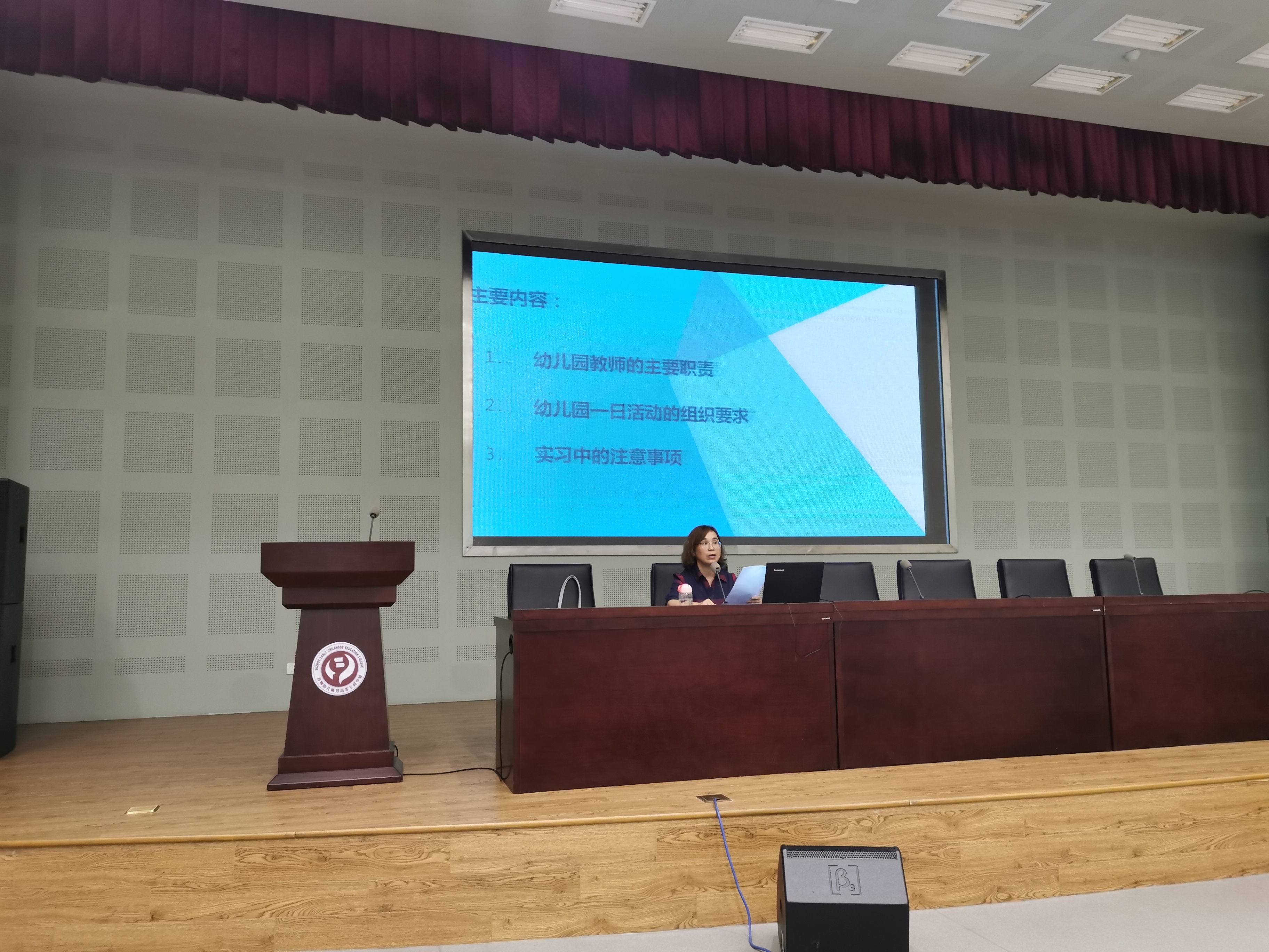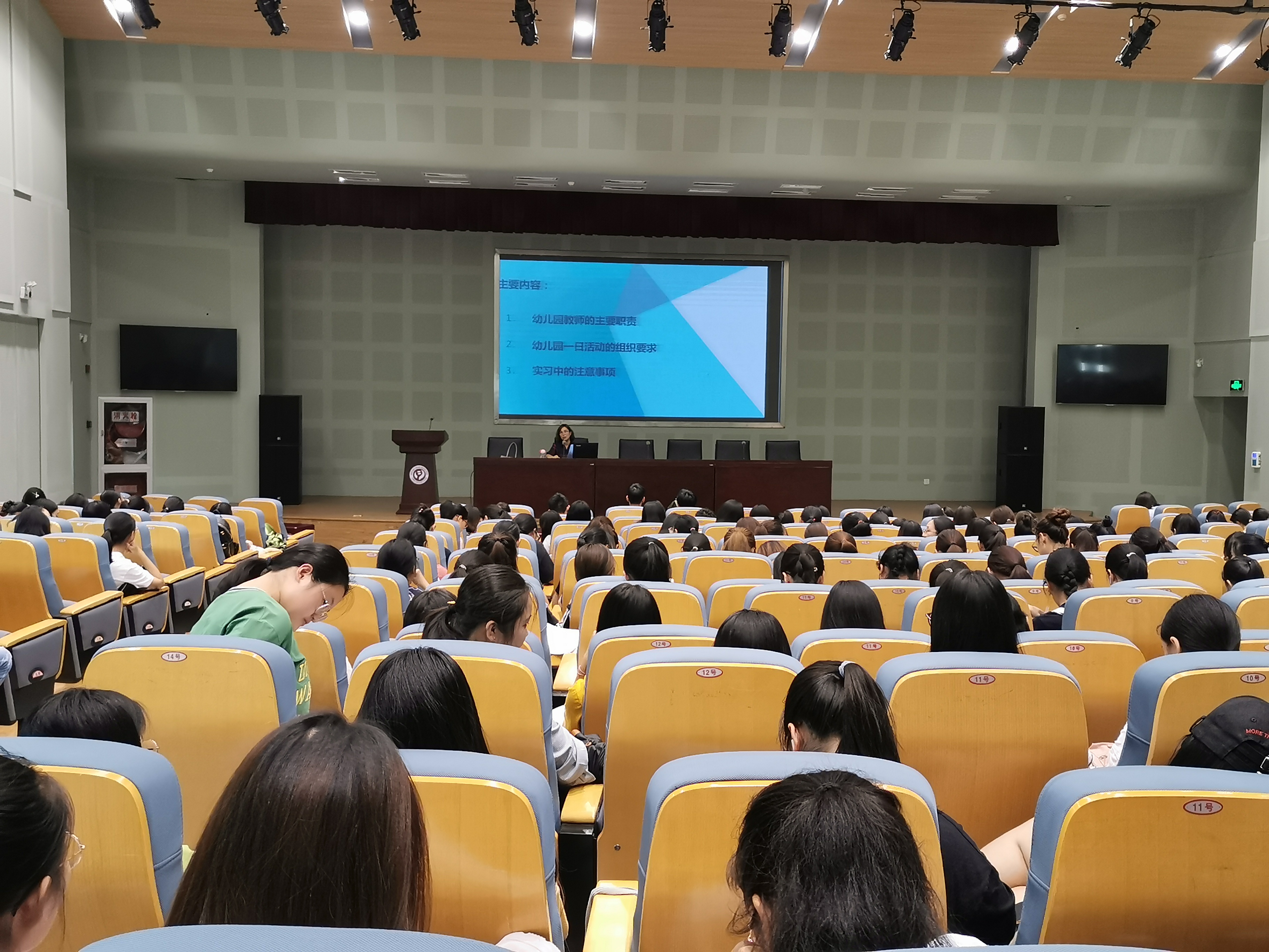 11月5日中午12:30在报告厅举行了学前二系18级教育实习动员大会。这次大会邀请到新城花园幼儿园的朱丽君园长做讲座,带队教师及学前二系18级全体学生参加了此次会议。