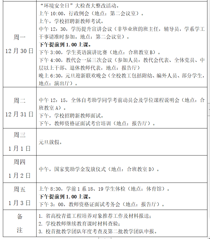 学校第十八周主要工作安排