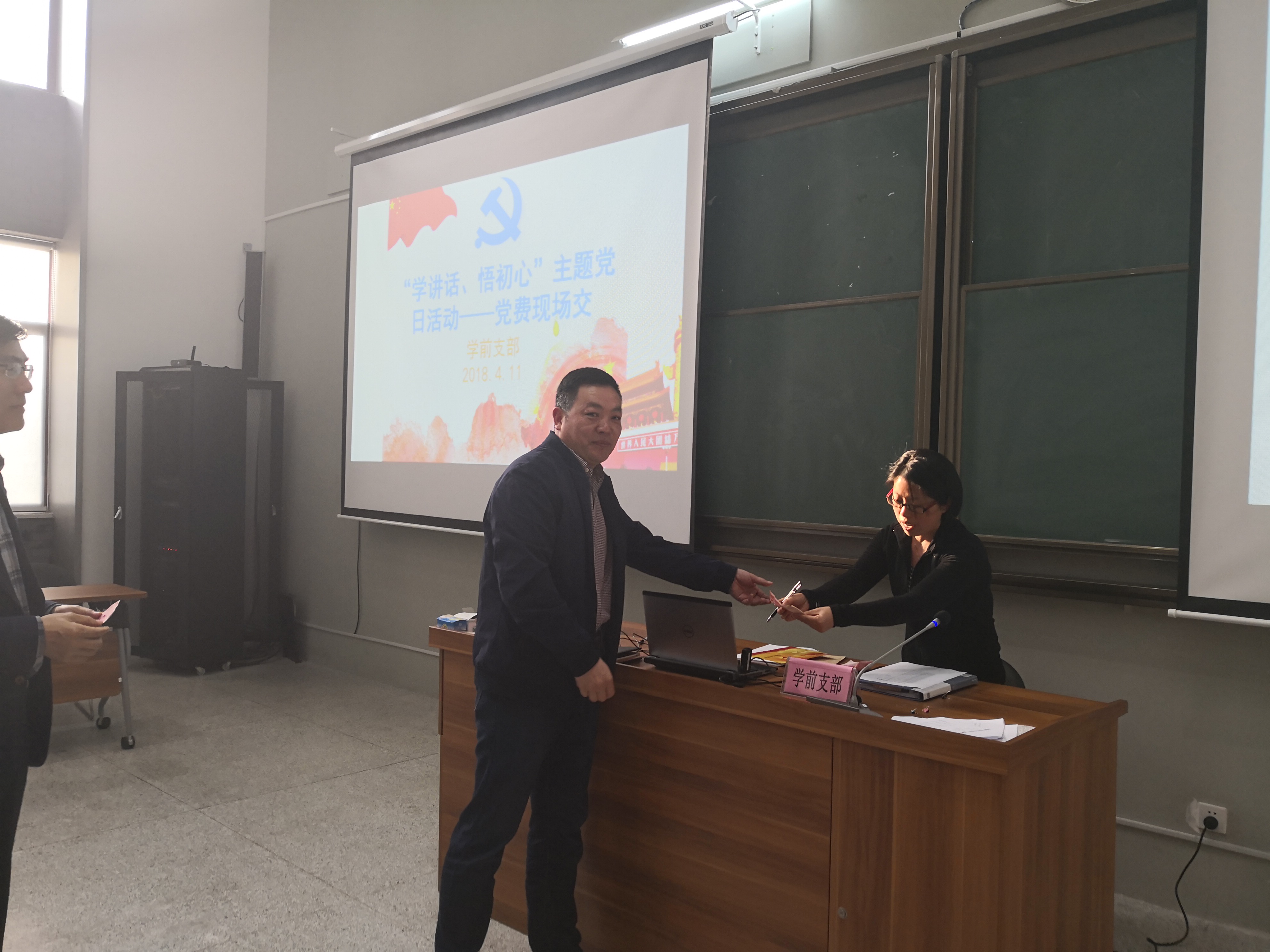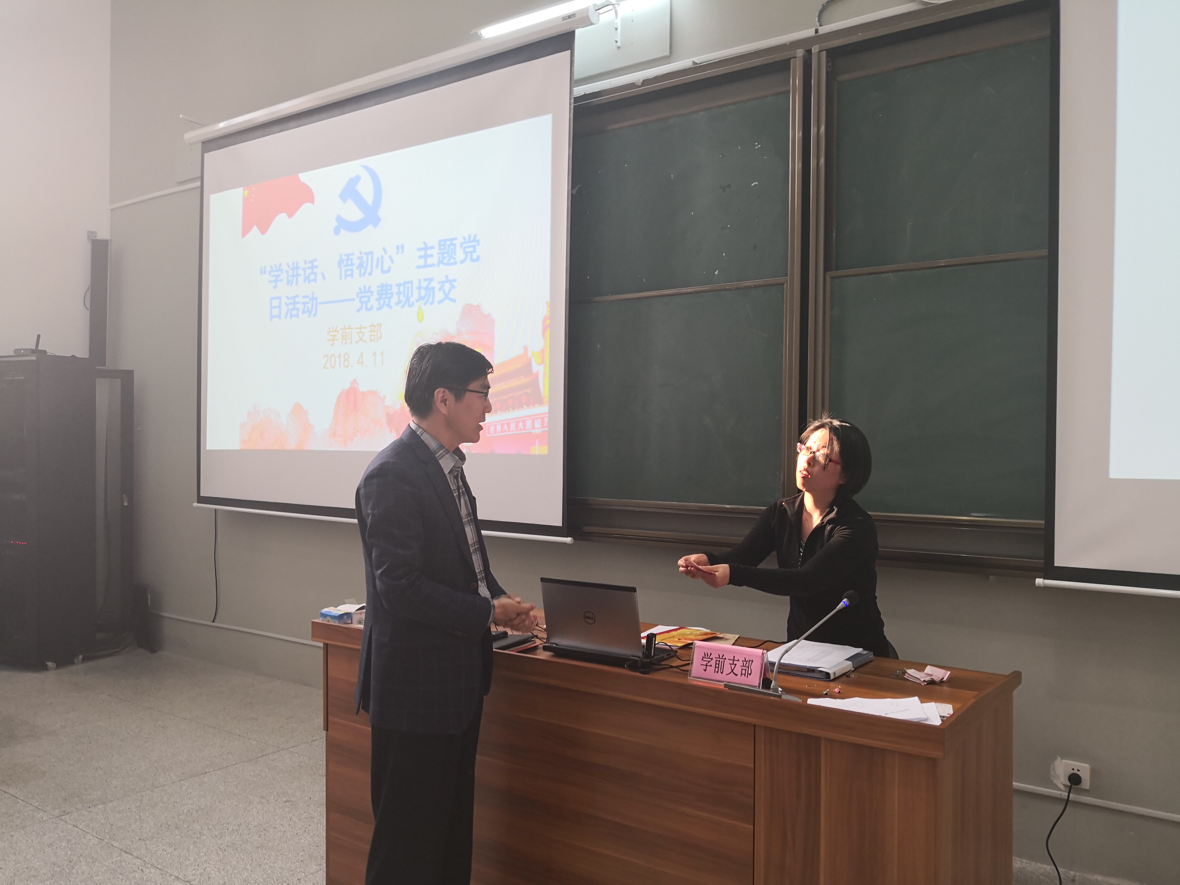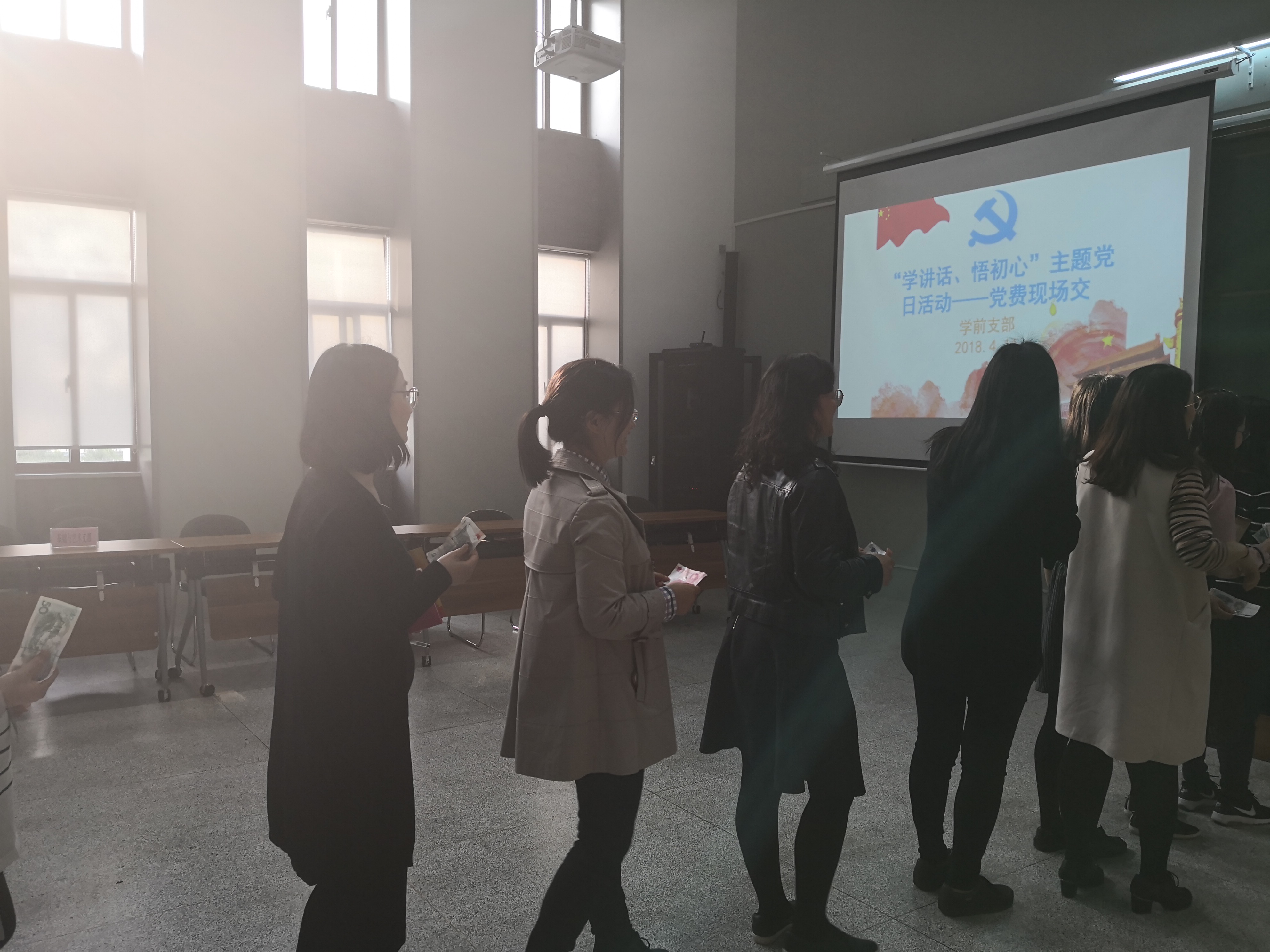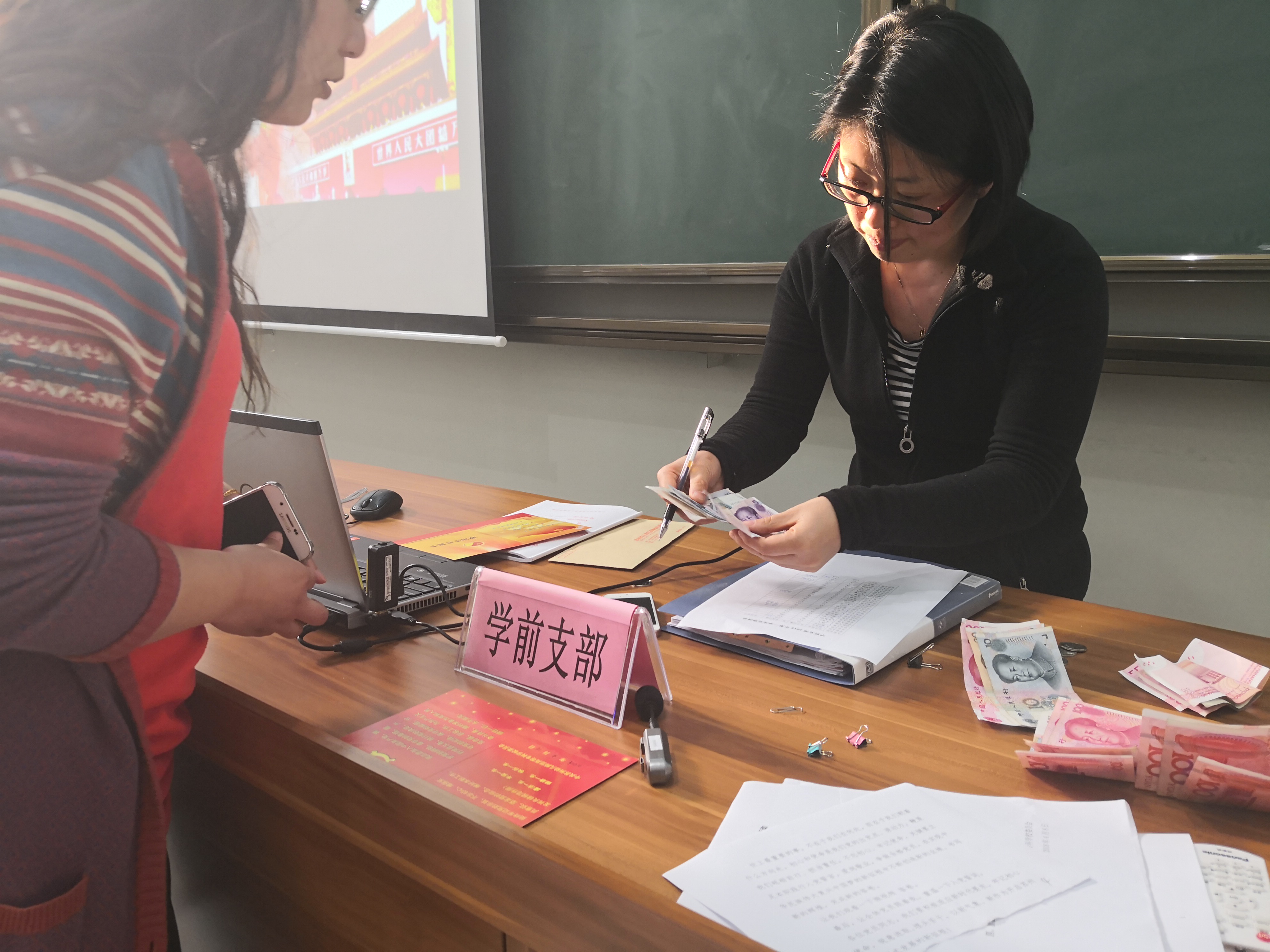 为深入贯彻落实党的十九大精神,丰富“学讲话、悟初心”主题党日活动,进一步提升支部党员教师的党性意识,严肃党内活动,更好地发挥党员的先锋模范作用。4月11日下午,学前支部在合班教室D开展党员教师“现场交纳党费活动”。