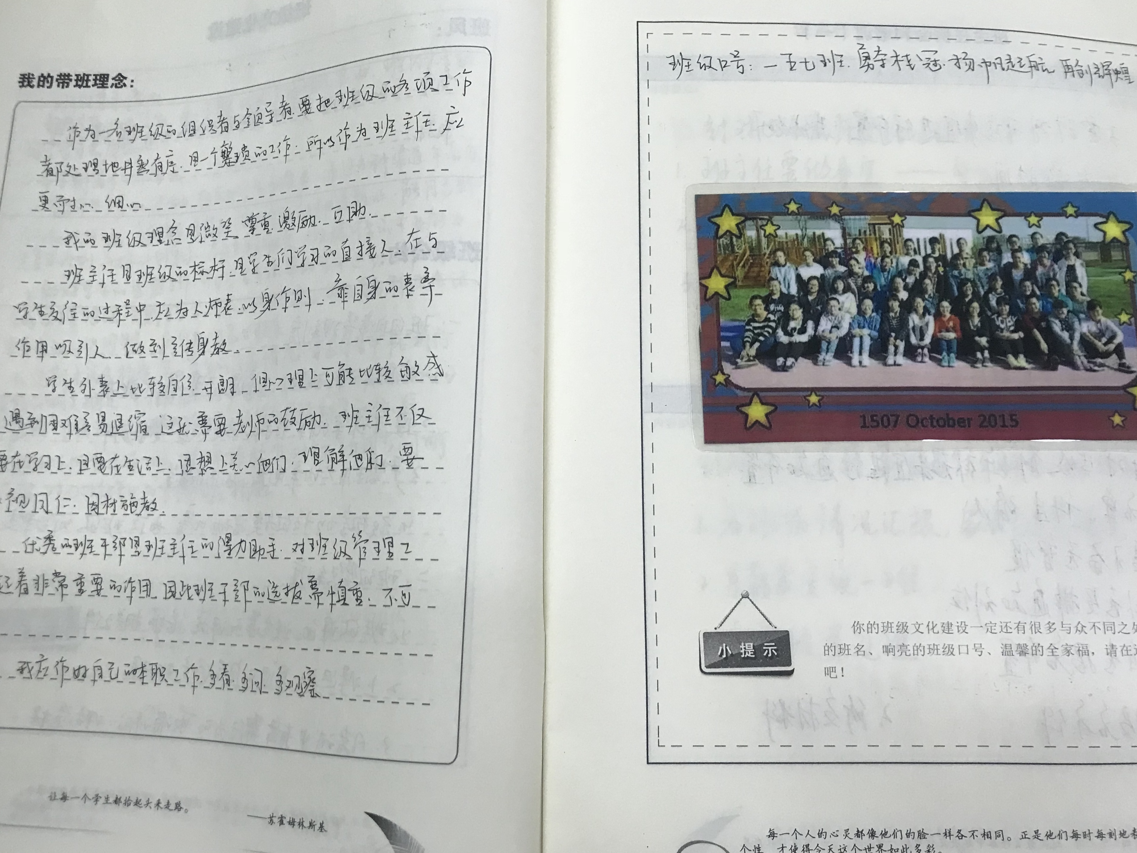 班主任专业建设之带班理念 来源:本站原创 发布时间:2018-12-19 15:05:12 浏览次数: 次 【字体:小 大】 班主任是班级管理的“核心”和“灵魂”,班主任工作是对学生进行日常思想品德、素质教育和指导学生健康成长的最重要的途径。班主任的思想和行为主导着整个班级的发展,影响着每一位学生,适时根据班级总体情况和学生的特点,提出符合班级发展的育人理念和奋斗目标,对于促进班级健康发展和班主任人格魅力的塑造具有十分重要的意义。(图为曹静老师班主任手册内容)(图为何冬怡老师班主任手册内容) 分享到: 【打印正文】