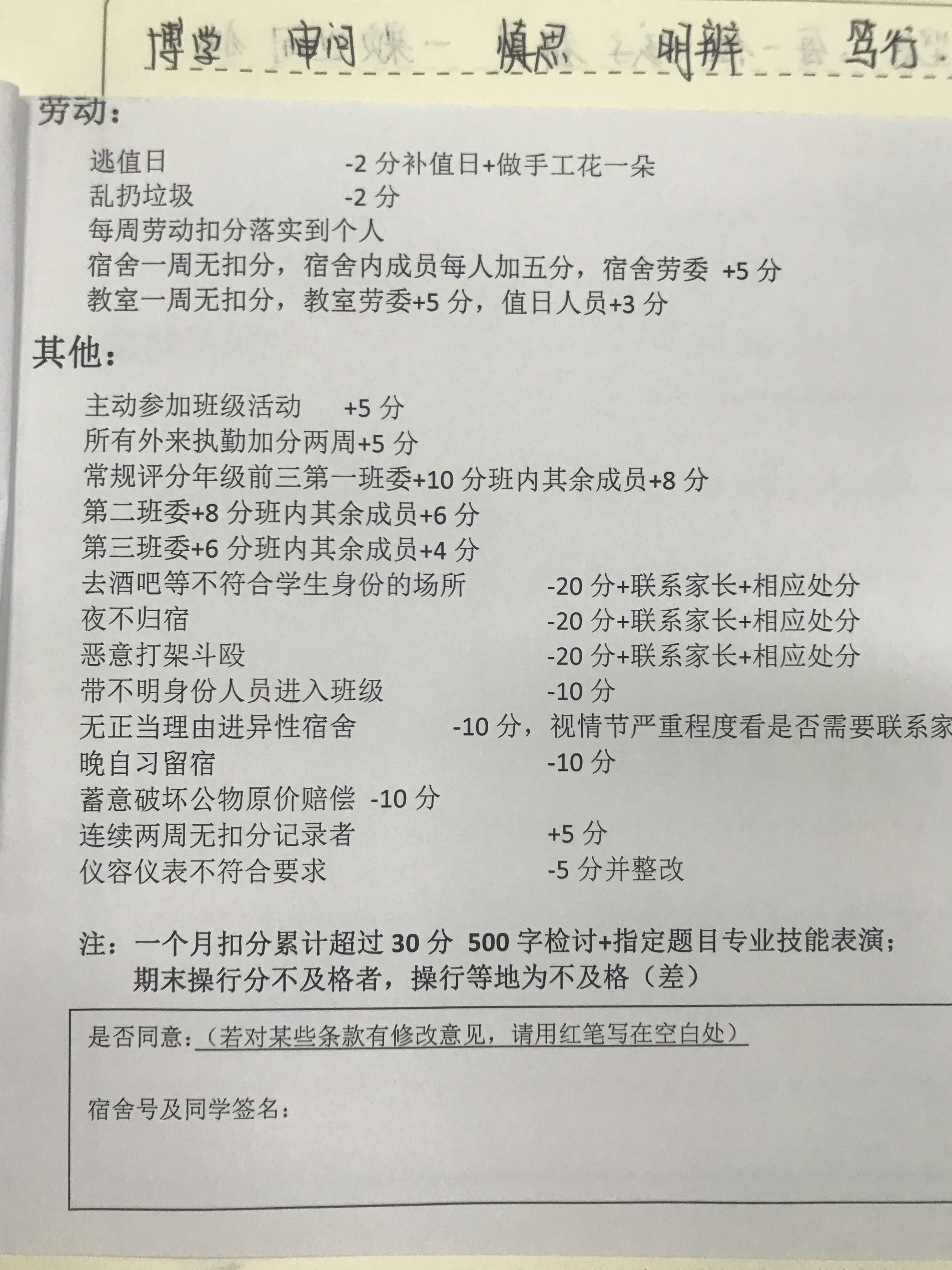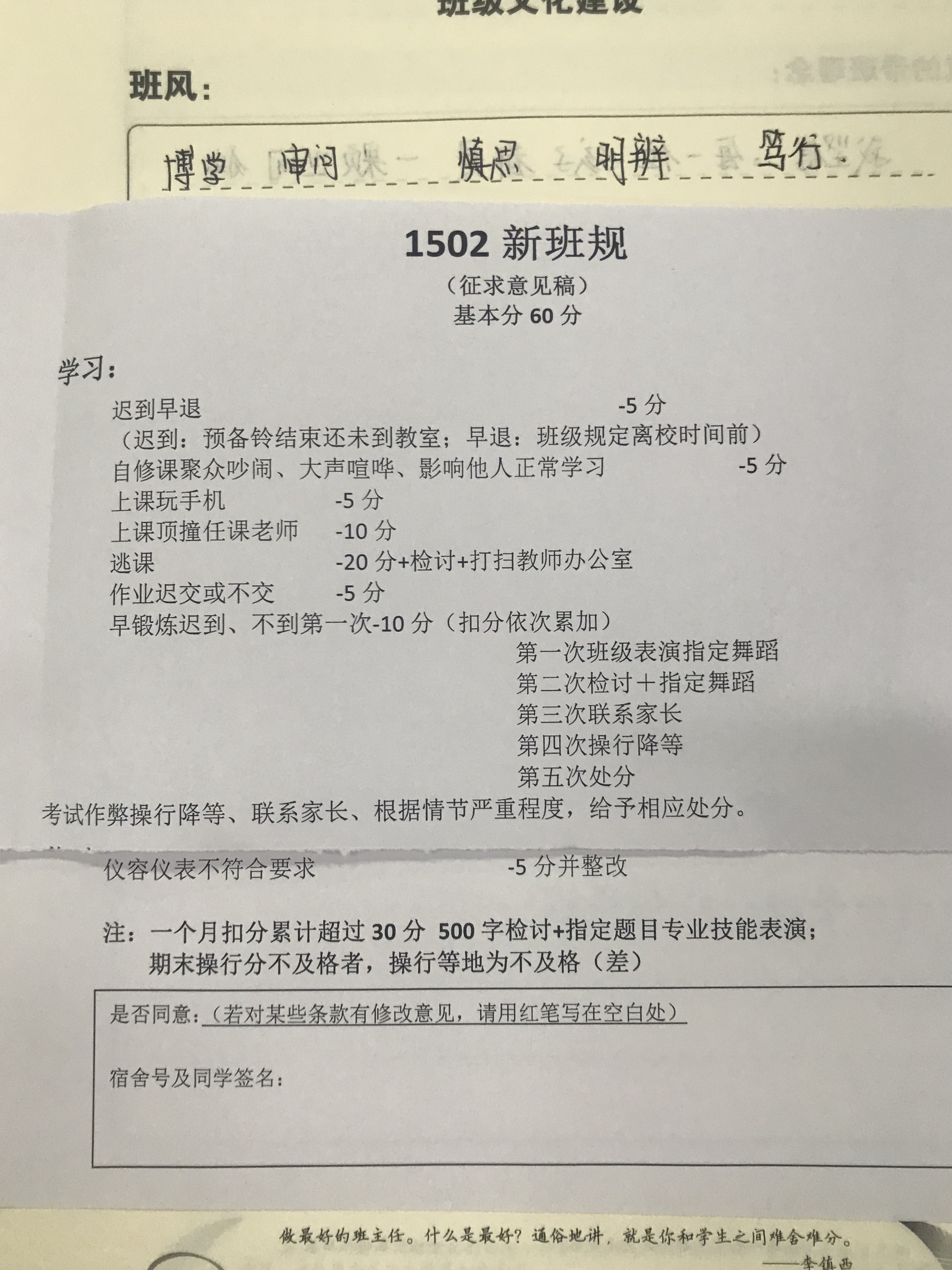 班主任专业建设之班规 来源:本站原创 发布时间:2018-12-19 15:14:37 浏览次数: 次 【字体:小 大】 没有规矩,不成方圆。班规是一个班级关于共同的行为标准、思想道德标准和文化标准的约定,是教师班级管理的重要工具,它在一个班级的日常运转中发挥着重大作用。班规对于规范班级行为、引领班级风尚、塑造班级文化起着非常重要的作用。同时,班规是辅助教师进行班级管理的重要工具。一个良好的班规就如同老师的影子,它可以有效地实现班级自主管理的目标,达到无为而治的班级管理境界。(以上均为贾莎莎老师班主任手册内容) 分享到: 【打印正文】