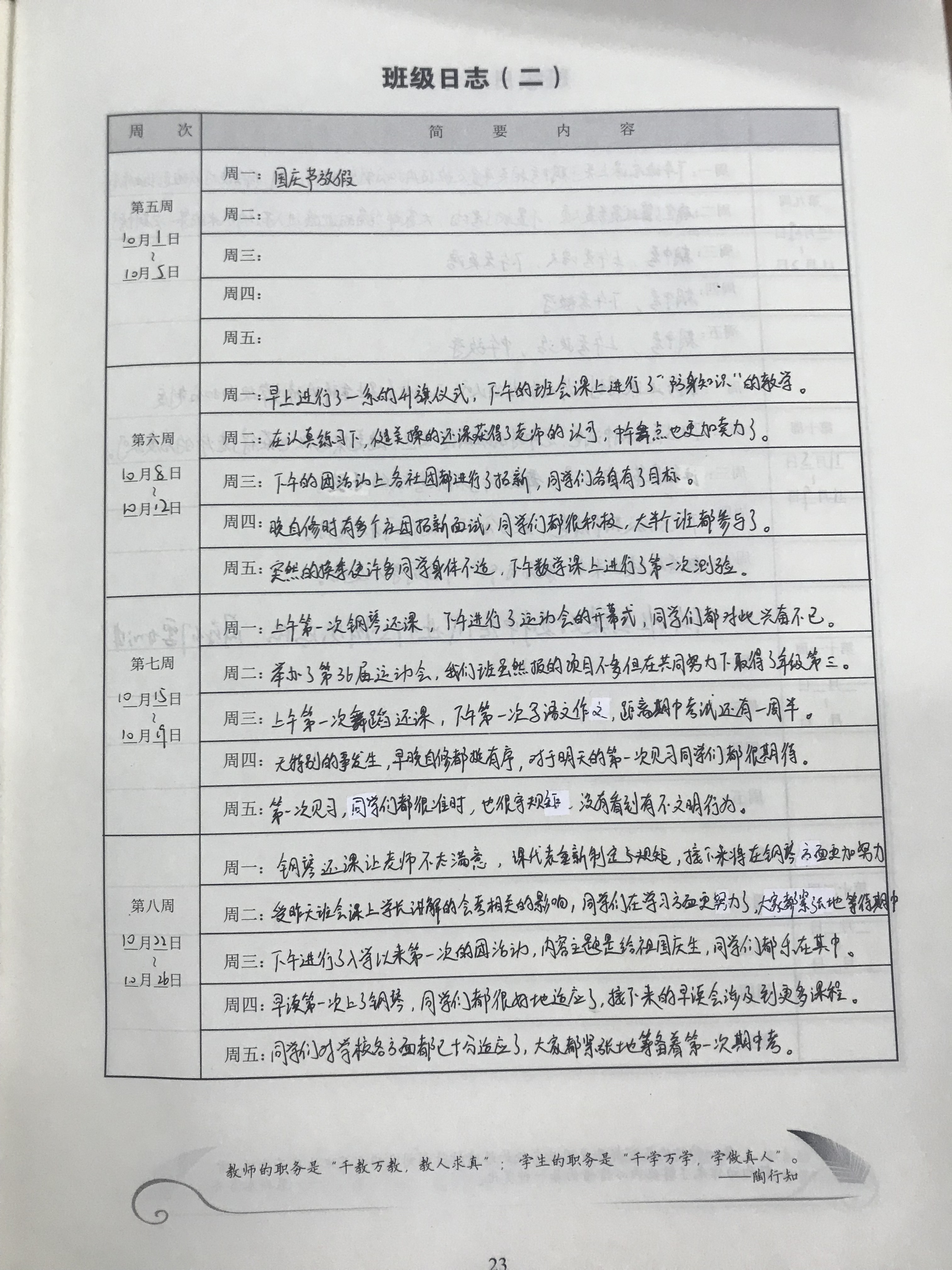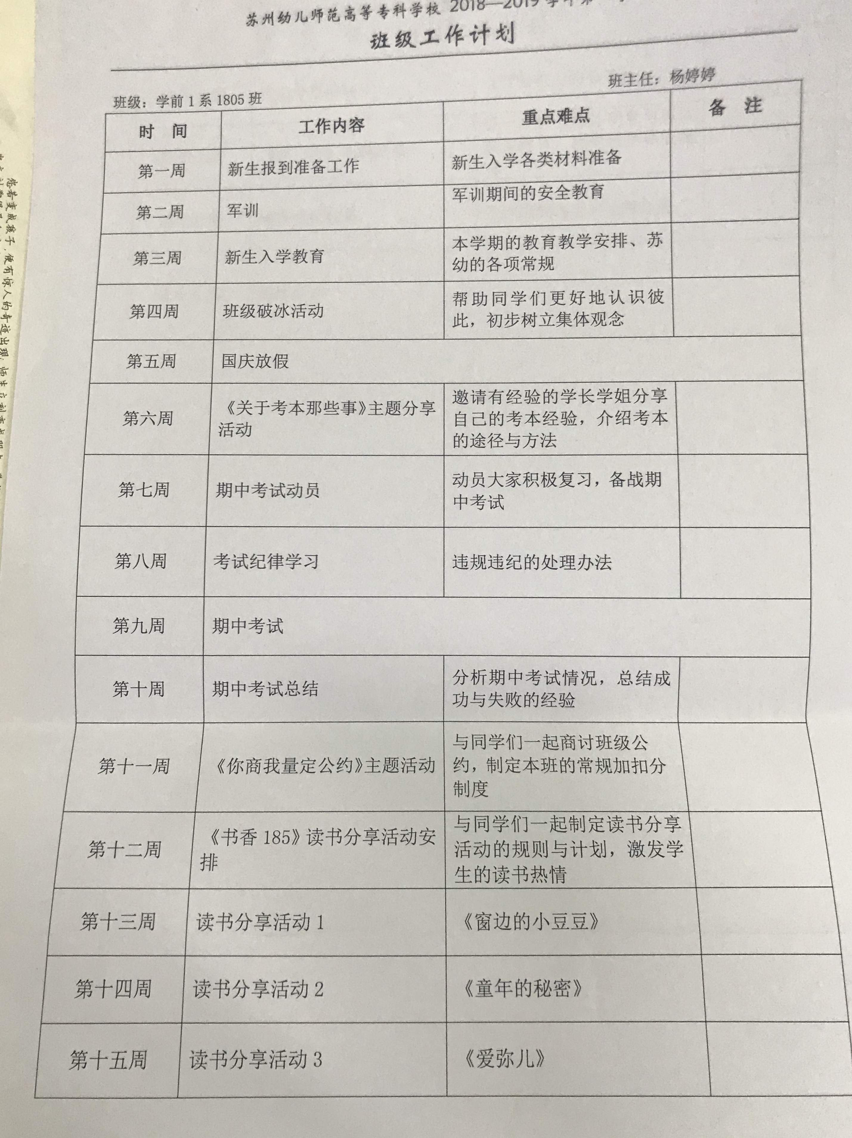 班主任专业建设之班级工作计划和班级日志 来源:本站原创 发布时间:2018-12-19 15:17:36 浏览次数: 次 【字体:小 大】 有了工作计划,工作就有了明确的目标和具体的步骤,就可以协调大家的行动,增强工作的主动性,减少盲目性,使工作有条不紊地进行。同时,计划本身又是对工作进度和质量的考核标准,对大家有较强的约束和督促作用。所以计划对工作既有指导作用,又有推动作用,搞好工作计划,是建立正常的工作秩序,提高工作效率的重要手段。(以上均为杨婷婷老师班主任手册内容) 分享到: 【打印正文】