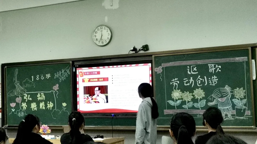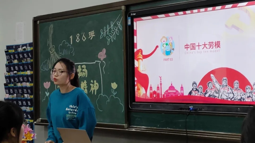 劳动者是最光荣的,奋斗是最美的姿态。186班以“弘扬劳模精神,讴歌劳动创造”为主题,讲述了有关劳动的意义以及祖国不同时代的劳动者风采。面对突如其来的疫情,从一线医务人员到各个方面参与防控的人员,从环卫工人、快递小哥到生产防疫物资的工人,千千万万劳动群众在各自岗位上埋头苦干、默默奉献,汇聚起了战胜疫情的强大力量。希望同学们都能做到辛勤劳动,爱岗敬业。不是岗位造就成才,也不是机遇给予成功,而是一种精神、一种责任、一种态度、一种境界成就了不负时代馈赠、不负历史青睐的人生答卷。