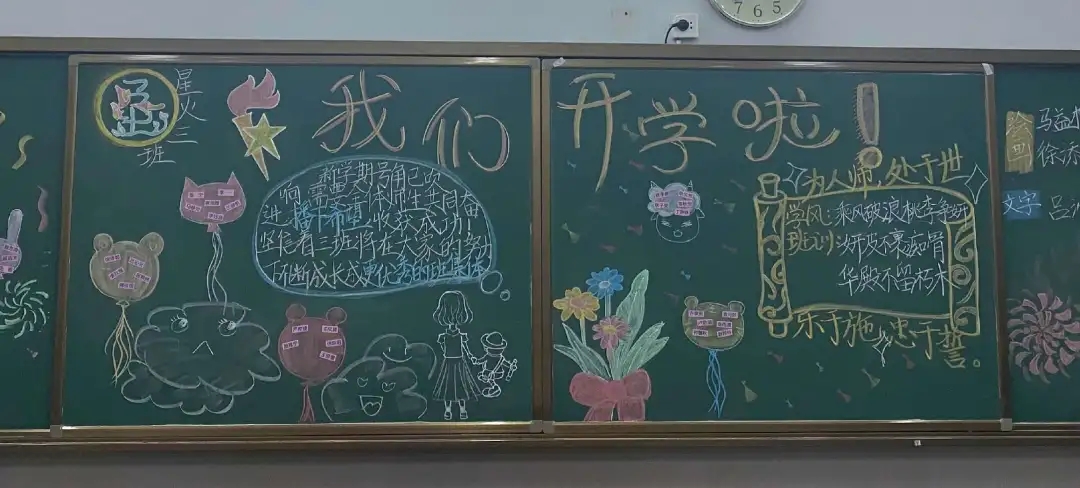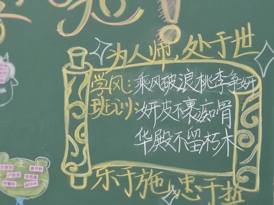 黑板报布置——原本一尘不染的黑板怎么突然就充满了色彩与图案呢?哈哈原来是我们的宣传委员和她的帮手在完成我们的黑板报。