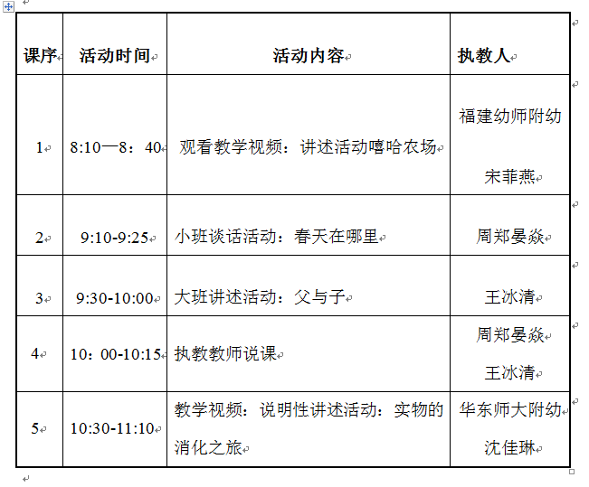 学前1系14级《幼儿园语言教育》幼儿园分散半日见习活动(远程) 来源: 发布时间:2018-04-03 16:14:11 浏览次数: 次 【字体:小 大】 2018年4月3日,我校组织了学前1系14级学生《幼儿园语言教育》课程的幼儿园半日见习活动,此次活动以远程形式开展,在我校演出厅进行。本次见习共10个班级,具体活动内容如下表: 分享到: 【打印正文】