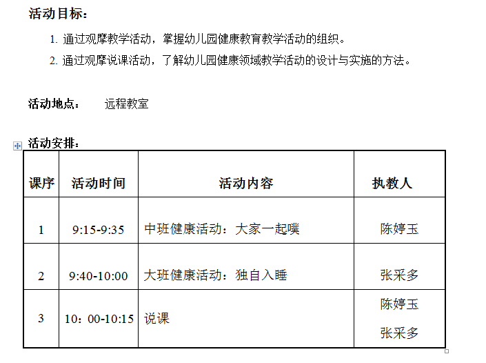 学前1系15级《学前儿童健康教育》幼儿园分散半日见习活动(远程) 来源:本站原创 发布时间:2018-06-04 08:56:28 浏览次数: 次 【字体:小 大】 2018年5月31日,我校组织了学前1系15级学生《学前儿童健康教育》课程的幼儿园半日见习活动,此次活动以远程形式开展,在我校演出厅进行。本次见习共9个班级,具体活动内容如下: 分享到: 【打印正文】