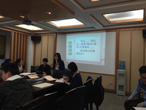 交流明辨会分为四部分,第一部分张晓丽老师梳理了社会主义核心价值观的历史演变,第二部分以“诚信”为引子,开展核心价值知识竞赛,并进行核心价值观宣传方式的思考和讨论,第三部分各年级代表进行社会主义核心价值观内容的阐述,第四部分到会团支书亲笔写下“我为社会主义核心价值代言”的代言心声!