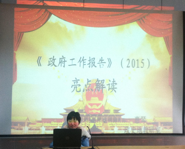 惠琴老师的精彩解读,使全体教职工进一步清晰地理解了2015年中央政府工作部署和“两会”精神。