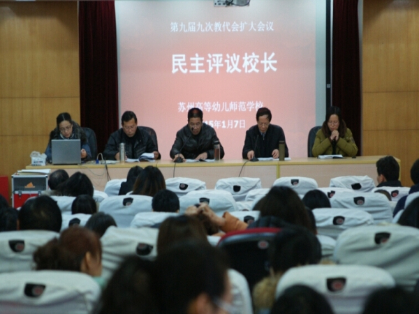 2015年1月7日,我校第九届九次教代会扩大会议在校本部102报告厅召开。大会应到代表52人,实到代表50人,列席代表43人,特邀代表3人。大会分别听取了孔宝刚校长、潘建中书记2014年度述职述廉述学报告,对孔宝刚校长的述职述廉述学报告进行了分组讨论和评议,并以投票的形式对五位校级领导进行了民主测评。