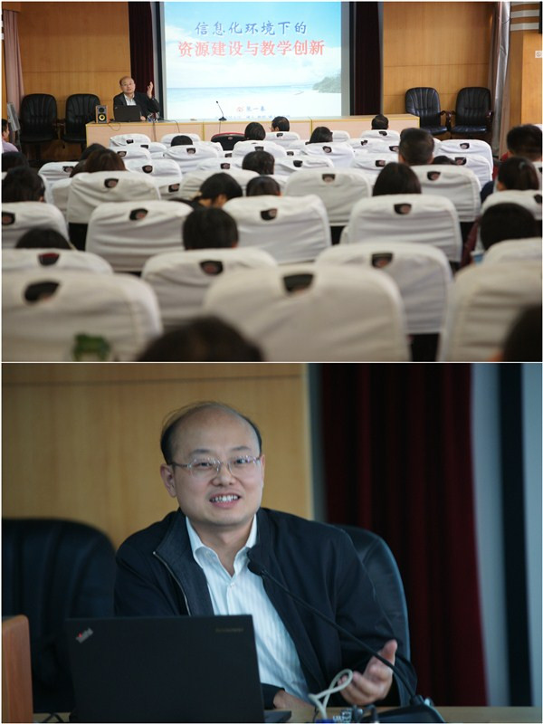 10月15日下午,我校邀请客座教授南京师范大学张一春老师为全体教师做了一场题为《信息化环境下的资源建设与教学创新》的专题讲座。张一春老师是南京师范大学教授,博士生导师,曾任南京师范大学现代教育技术中心负责人,现任南京师范大学继续教育管理处处长,继续教育学院院长,是南师大教学名师,多年来一直从事教育信息技术的教学、研究、培训和推广工作。张老师通过一段段小视频介绍了现代信息化环境下的教育资源的发展,以及各种资源在现代学习中的使用。以具体的教学录像为例从多方面分析如何制作和有效的利用教学资源,详细分析了微课是什么以及如何制作微课。通过讲座,希望教师在教学中能够有效的使用和优化教学资源,同时在信息化的环境下,对教学资源的使用也要有深刻的反思。