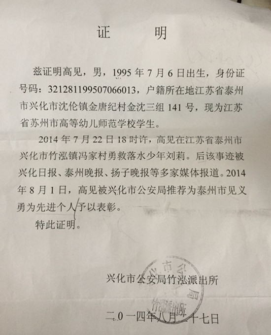 记者了解到,高见今年20岁,目前就读于苏州高等幼儿师范学校。块头并不算大的青年怎能从河底救人?原来,高见在师范学校里是体育健将,多次参加学校组织的舞蹈、健身操等大型活动,练就了一副好身体。(2014年07月28日 宋燕)
