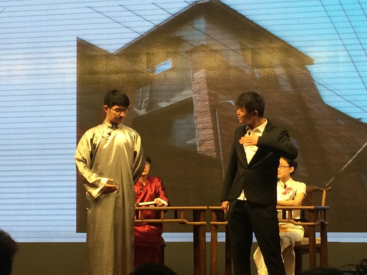 此次我校自主创编的三话剧,以“阿万茶楼”的形式讲述抗日战争期间苏州图书馆馆长蒋吟秋藏书、护书的英勇事迹,表现苏州文人为抗战做出的卓越贡献。这一剧本的编排获得了评委们的一致好评,138班朱君谊同学作为主要选手充分发挥了他在苏州话方面的突出特长,得到了苏州著名评弹表演艺术家、苏州评弹博物馆副馆长袁小良先生和苏州电视台主持人吴静的高度肯定。此次三话剧本从9月份开始酝酿,中间几易其稿,剧本的表演能够取得骄人成绩,离不开指导老师和同学们在业余时间的辛苦付出。