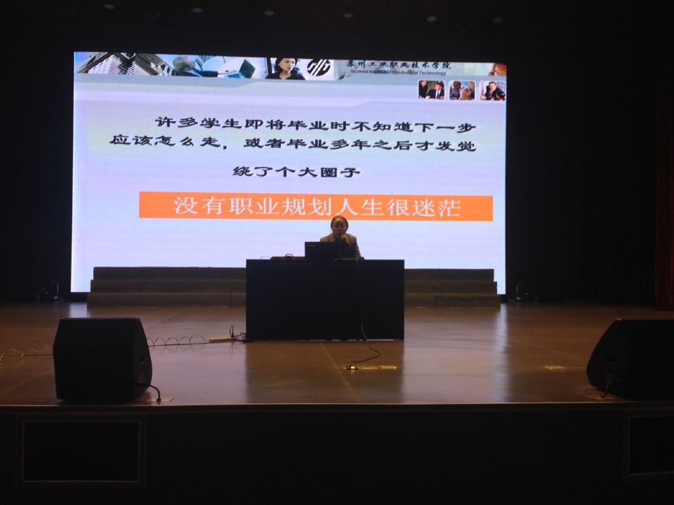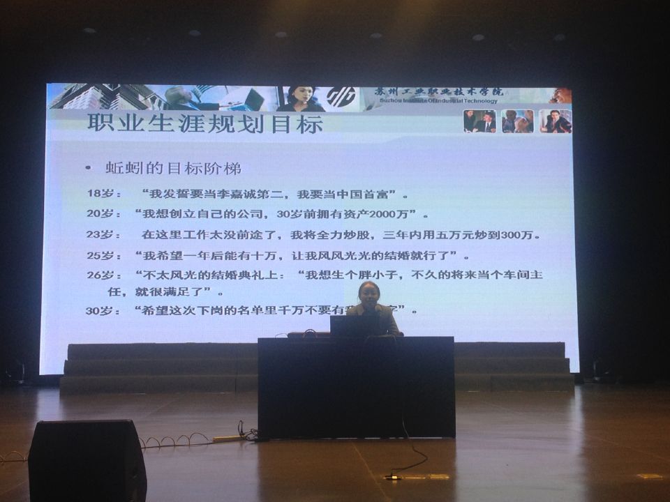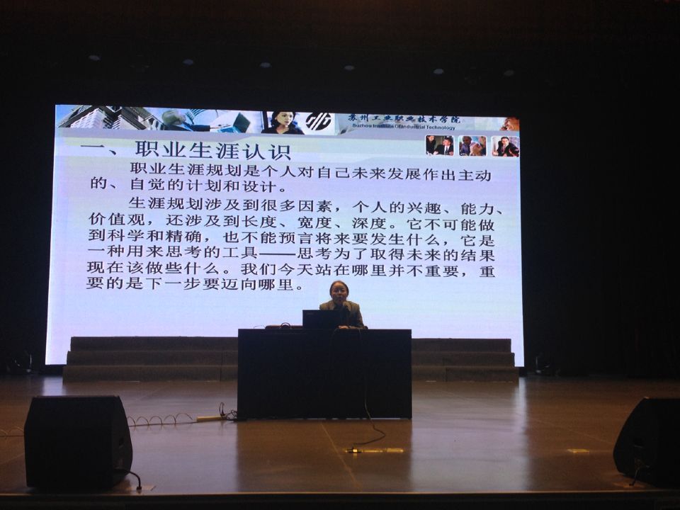 为了让同学们更好的掌握生活的罗盘,做到“我的大学我做主,我的未来我谋划”,我校学前1系于2016年12月6日晚18:30在演出厅举行了职业生涯规划讲座活动。本次讲座有幸邀请到苏州工业职业技术学院梁青春副教授来和我系全体13级同学一起畅谈职业生涯规划。