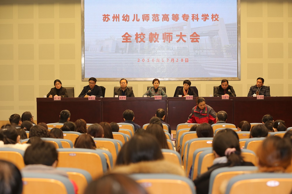 2016年12月28日下午,苏州市市委组织部干部四处副处长张素君,市委教育工委书记、市教育局局长顾月华,市教育局副局长高国华,市委教育工委副书记沈建平来校宣布干部任命决定。市教育局办公室、人师处、高职处、组织处相关负责人,学校全体教职工参加会议。