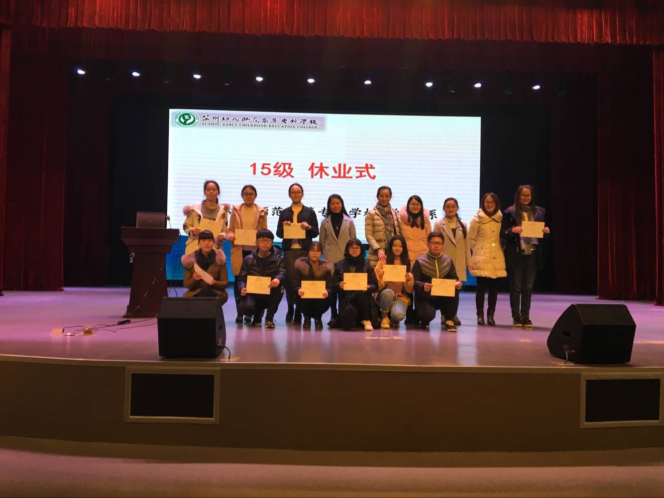 2017年1月6日上午10:30,学前1系15级在演出厅进行了休业式活动。本次休业式分为三大环节:第一环节为15级班主任代表陈菲菲老师对本学期进行总结分享,陈菲菲老师从“机会”、“灵活”、“配合”三个词出发,让学生们学会筛选机会,给人机会,争做一名灵活的学习者和灵活的表达者,并在学习与生活中学会基于理解与尊重的配合。
