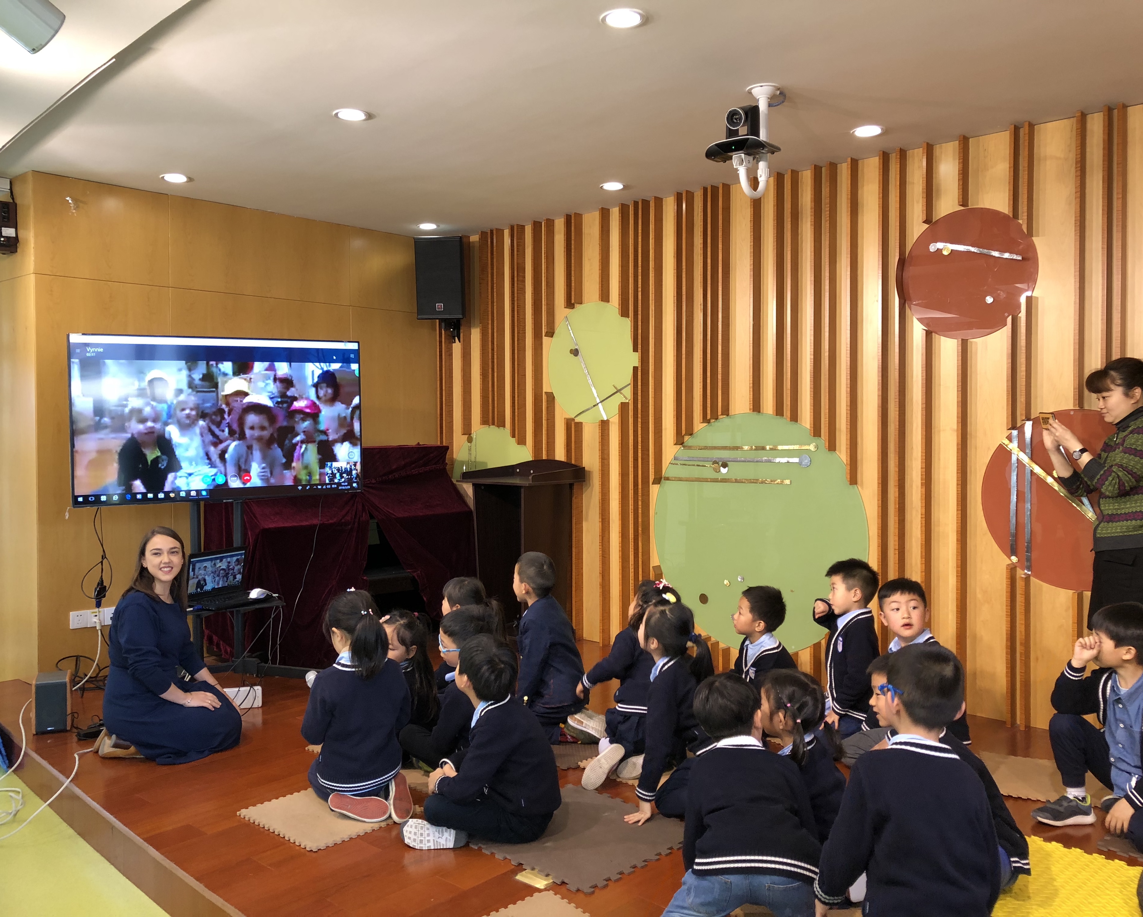两天里,澳洲幼教同行参观了春意盎然的校园,户外游戏区丰富多彩,室内的专用室活动精彩纷呈,儿童实习场地游戏与课程紧密结合……园所的环境创设、幼儿的主动表现、生活化游戏化的课程理念等都引得澳洲同行啧啧称赞! 双方老师首次尝试带领小朋友们通过网络视频手段互动。热情的中英文互动,耳熟能详的东西方歌谣,通过网络跨越了国界缩短了彼此间的距离,开启了国际间的亲密联络。