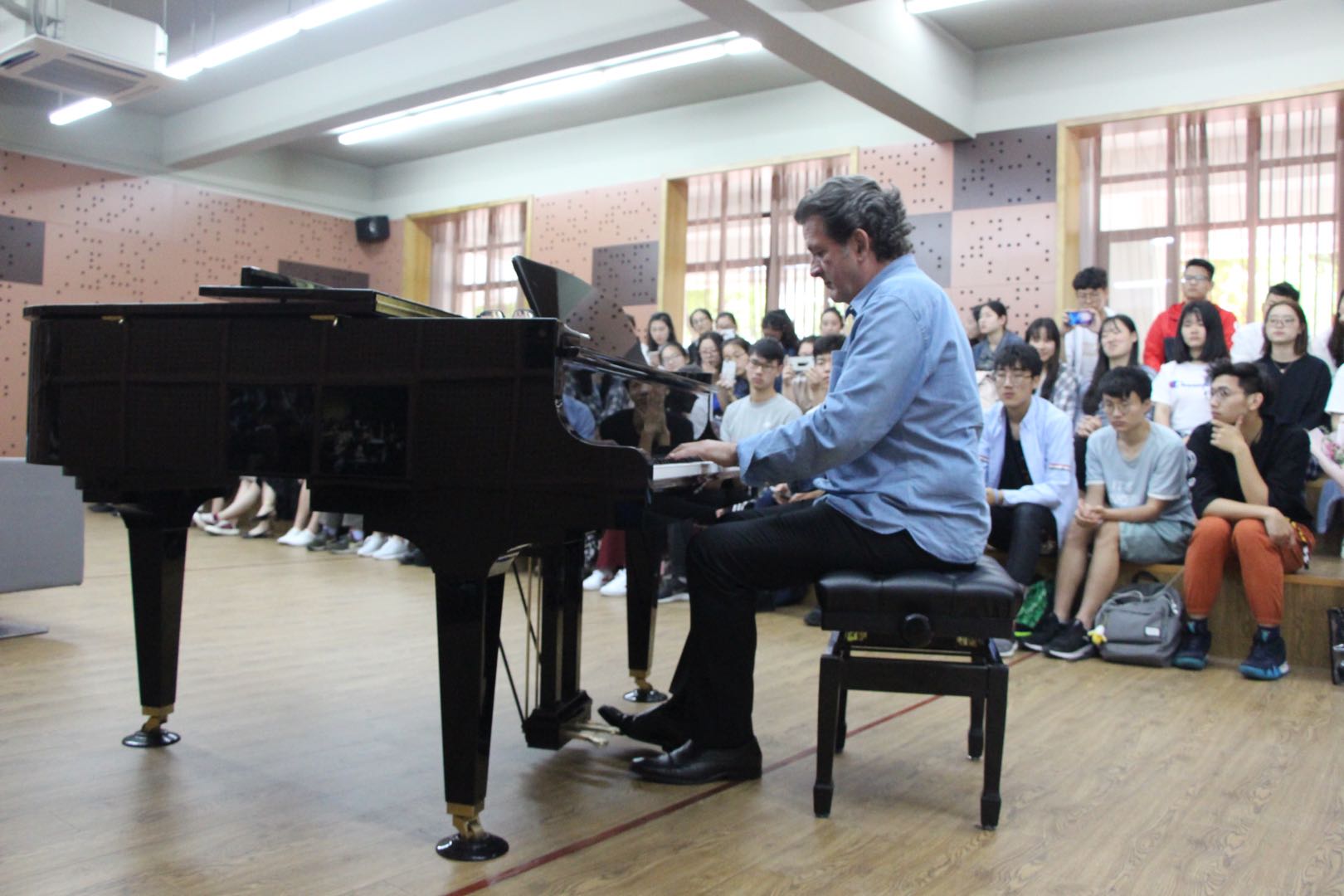 5月10号下午,在初夏的微风吹拂下,法国著名爵士钢琴家菲利普·莱奥吉来到我校与17级音教音表学生举行校园艺术沙龙活动。菲利普·莱奥吉六岁起学习钢琴,在他四十五年的演奏生涯中,担任乐队的领袖、音乐总监及首席钢琴,创立艺术节,在挪威、瑞典、德国、美国、中国、韩国和法国举行了一系列钢琴独奏会,他还经常现场演出进行编曲,灌制了多张唱片。2014年,《我的法文标准歌谣集》在由法国知名杂志组织的“第二十五届最好的爵士CD”评选活动中获得殊荣。此次沙龙活动,莱奥吉先生除了在现场为我们艺术系学生在钢琴弹奏中进行专业指导,还阐述了爵士钢琴的魅力所在,即激进、前卫、突破、创造。爵士钢琴曲因为节奏上的变化打破了一个相对规整的律动,使得它随性为主,节拍可以随意变换,从而带来了“摇摆”和“变幻”的感觉。之后,他给我们学生演绎了他精选的两首法国民歌《玫瑰人生》《乘上A列车》,以及两首中国民歌《浏阳河》和《采茶扑蝶》,他娴熟的弹奏技巧、投入的感情理解以及耳熟能详的曲目使学生和老师完全被打动,收获了阵阵掌声和欢呼。