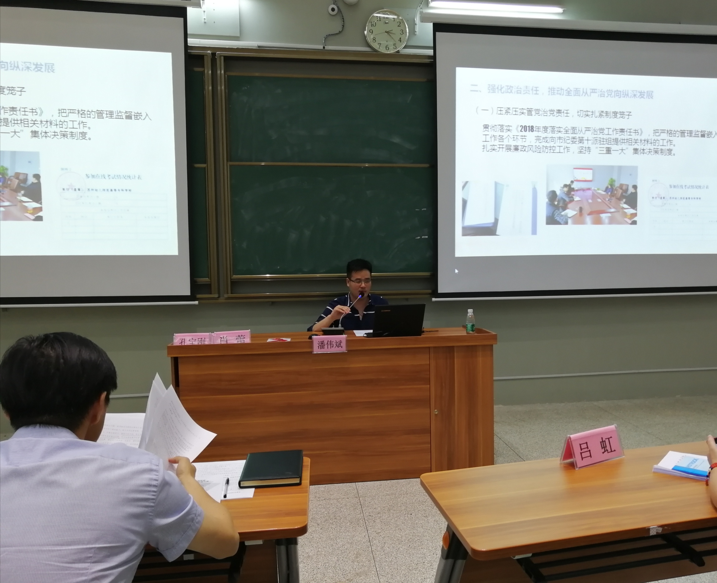 第四项议程是由组织人事处副处长潘伟斌做本学期学校党建工作的总结,潘伟斌回顾了本学期学校在党建工作中取得从成绩:学校上下全面深入学习习近平新时代中国特色社会主义思想,以省市书记项目为依托,在“学讲话 悟初心”主题党日中创新思路,以“2+X”开展主题党日,受到各大媒体报道;“凝聚发展正能量 注入发展新活力”成功入选2017年度主题党日优胜奖,申报市先锋党组织、先锋书记,申报市师德建设案例;以智慧党建平台为依托,规范开展“三会一课”,对下学期的重点工作进行了布置。
