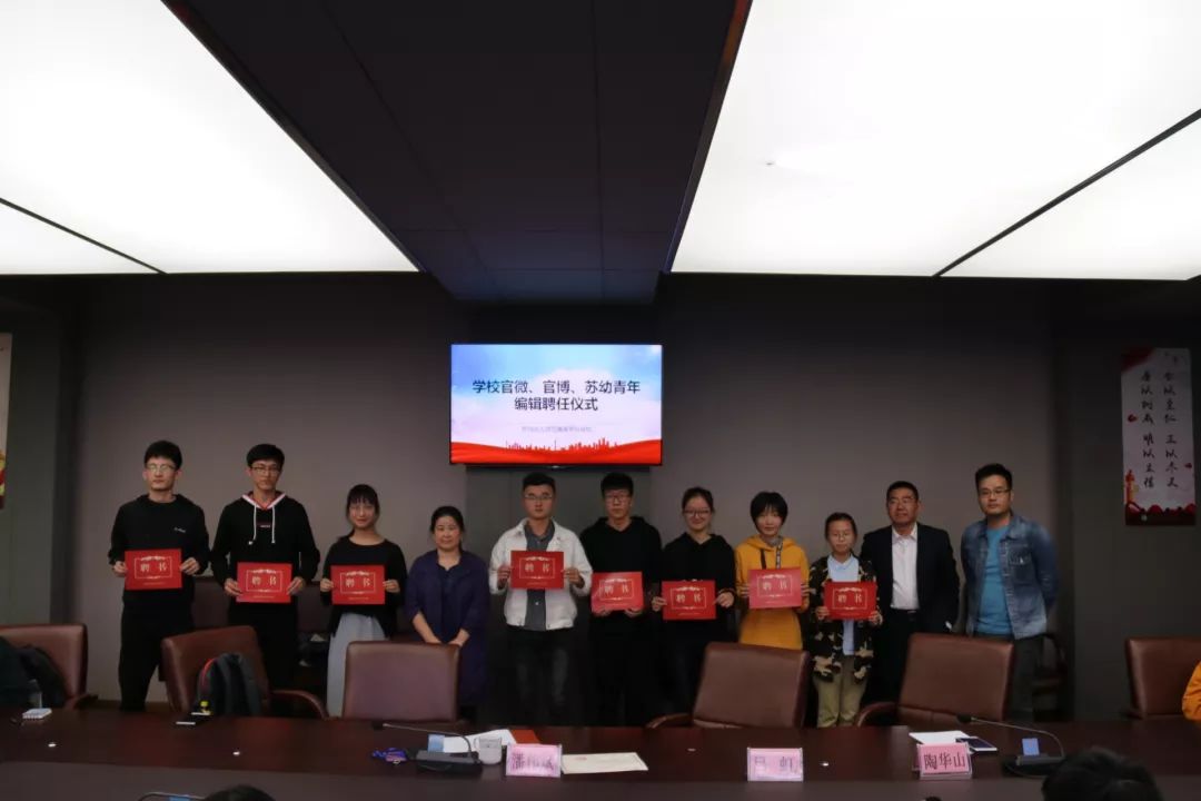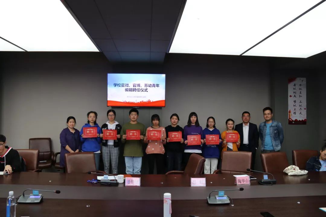 10月17日下午三点半,在校第二会议室,举行了我校官微、官博、苏幼青年编辑的聘用仪式。吕虹副校长、陶华山副校长、组织人事处潘伟斌副处长及40多位同学参加活动。