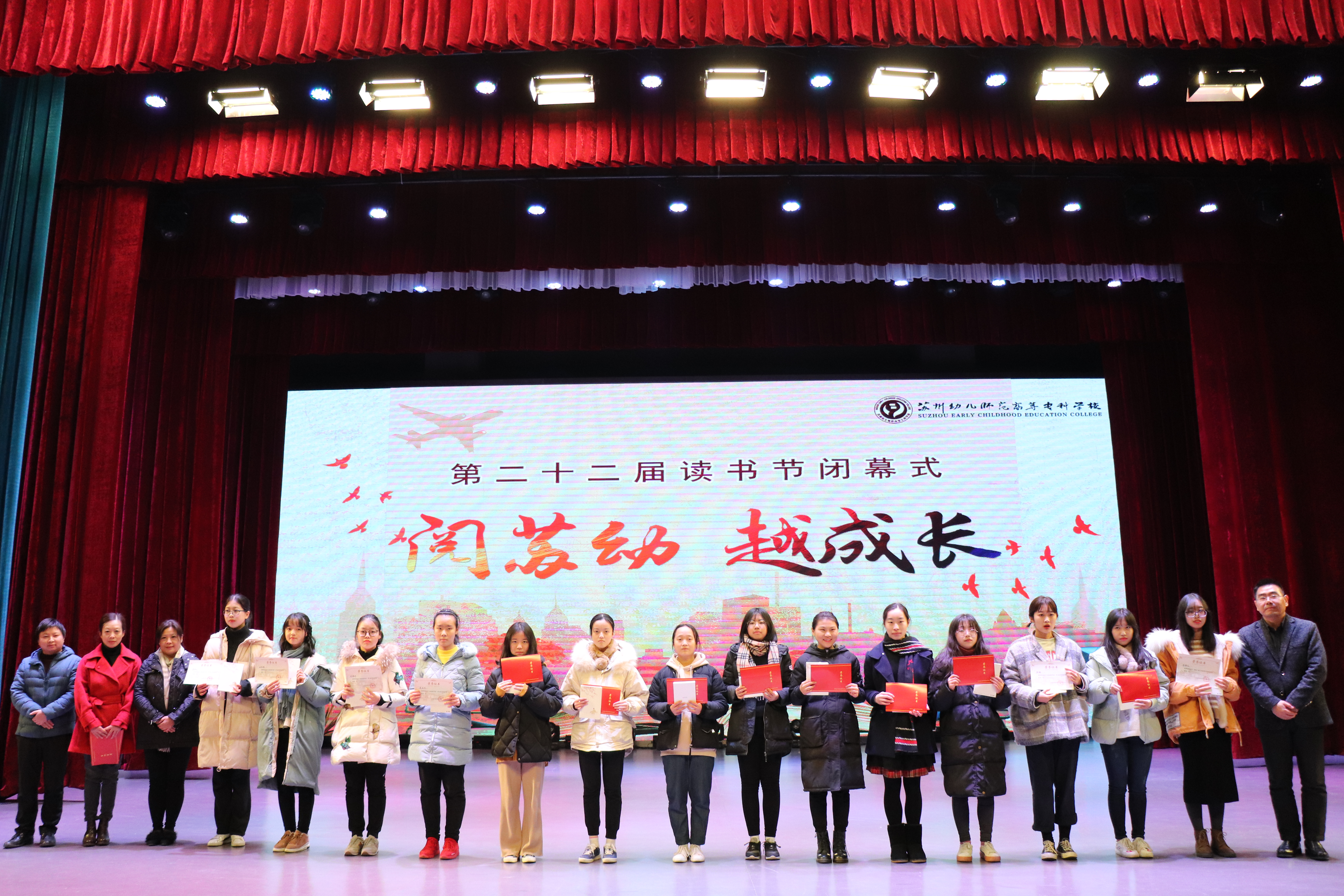 胸藏文墨怀若谷,腹有诗书气自华。2018年12月28日晚间,我校第二十二届“阅苏幼,越成长”读书节闭幕式在演出厅顺利举行。副校长陶华山、国际交流处处长蔡红雨、团委副书记周慧明、图书馆馆长张卫平等领导及部分老师代表,读书节各项活动受表彰学生、学前一系、学前二系以及艺术系的18级全体学生出席了闭幕式。