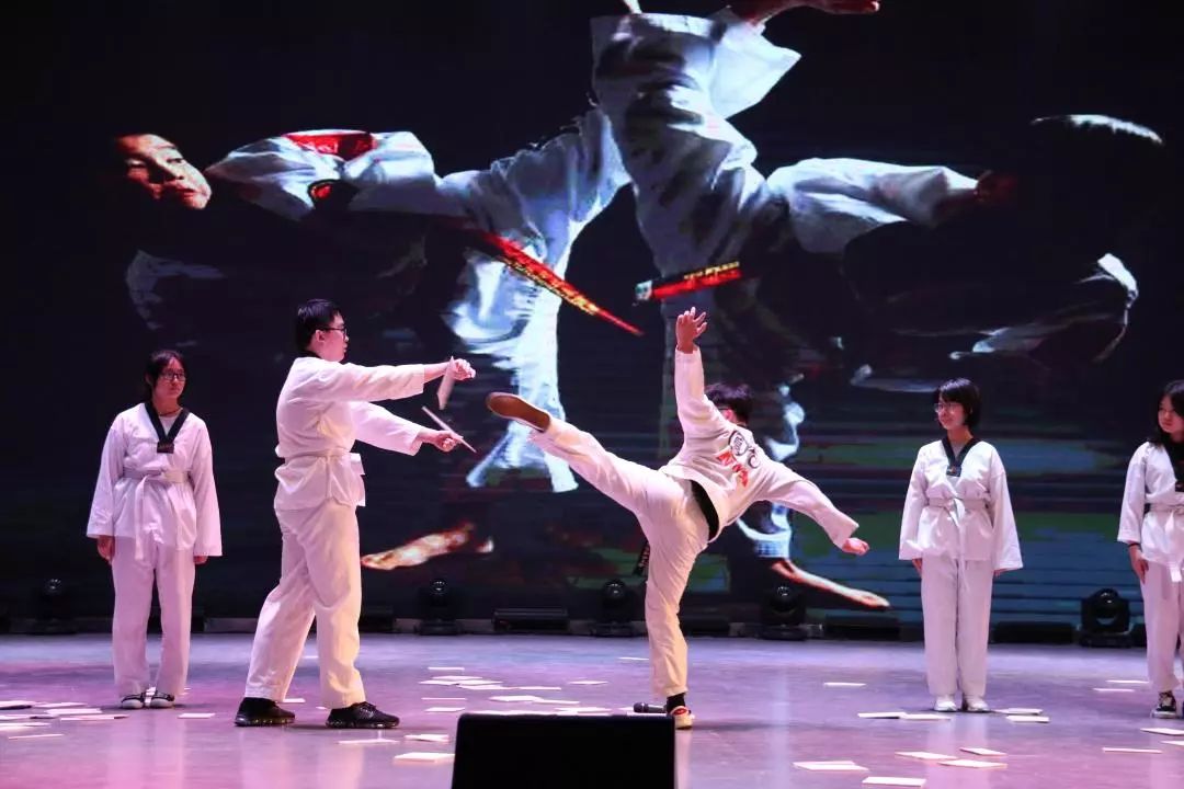 跆拳道社以气魄非凡的规定套路展示,吸引了一众目光。花样踢板,手起手落,利落干脆。