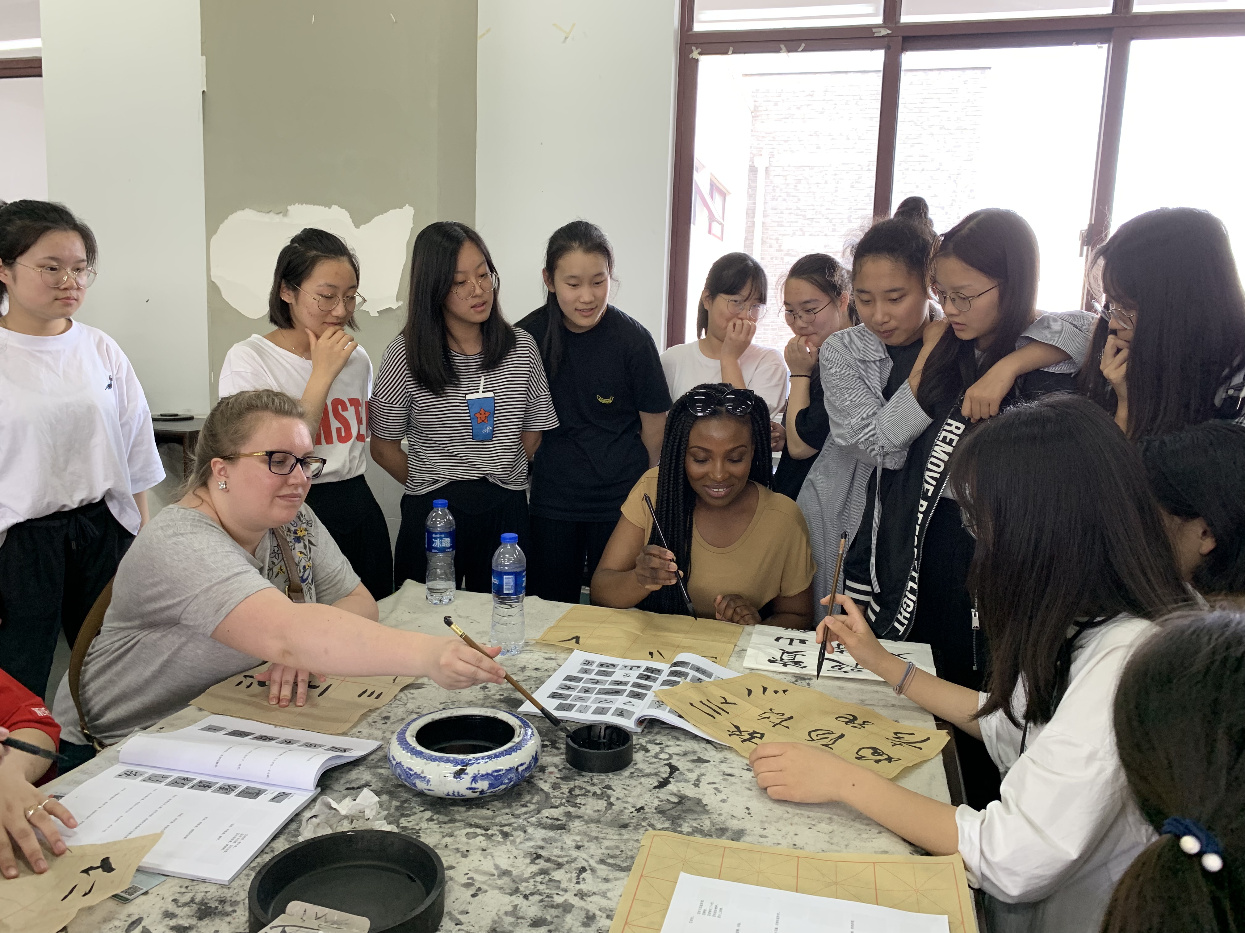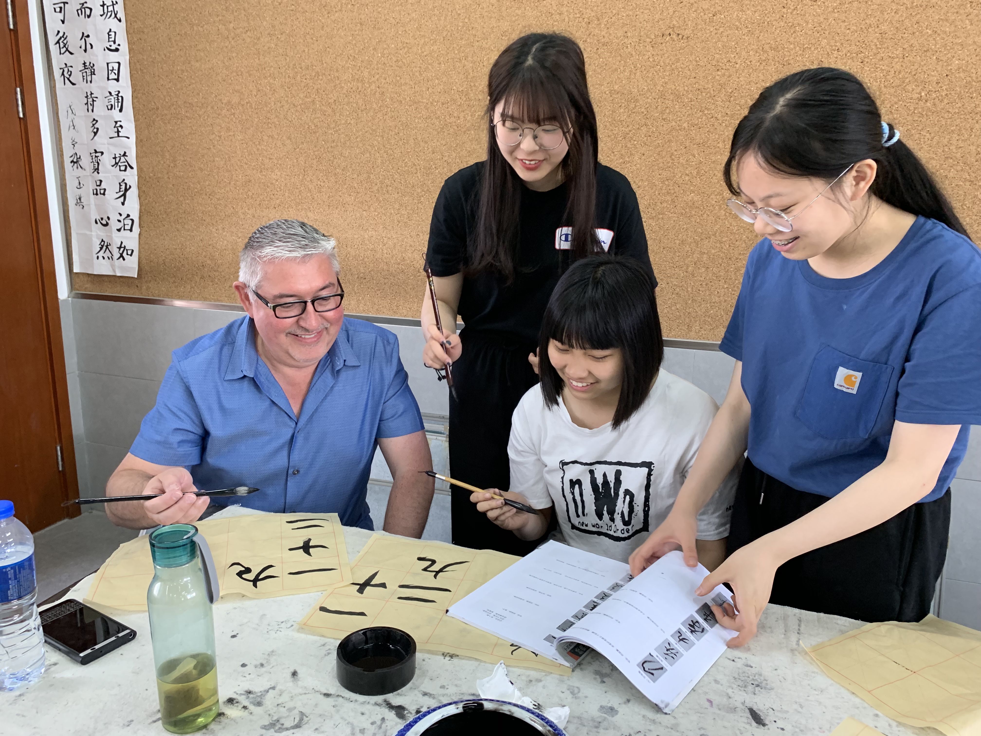 随后客人在蔡处长的带领下,参观了校园,浏览专业教室、实训室、图书馆等,接着走班随堂观摩了一些艺术类的技能课。孙莹、承轶妍老师的声乐课、赵欢老师的书法课、刘珈老师的电钢琴课、袁薇、高菲菲、张强老师的舞蹈课等都给客人留下了深刻的印象,他们赞叹我校对学生在艺术素养和技能方面的培养。在赵欢老师的书法课上,客人饶有兴趣地参与到小组书法练习中,跟着我们的老师和学生一起练习书法,而老师和同学们也非常热情的指导客人如何握笔、运笔和顿挫,最后客人们拿着自己的作品露出了开心的笑容,同时感叹汉字文化的魅力和书法的艺术之美。