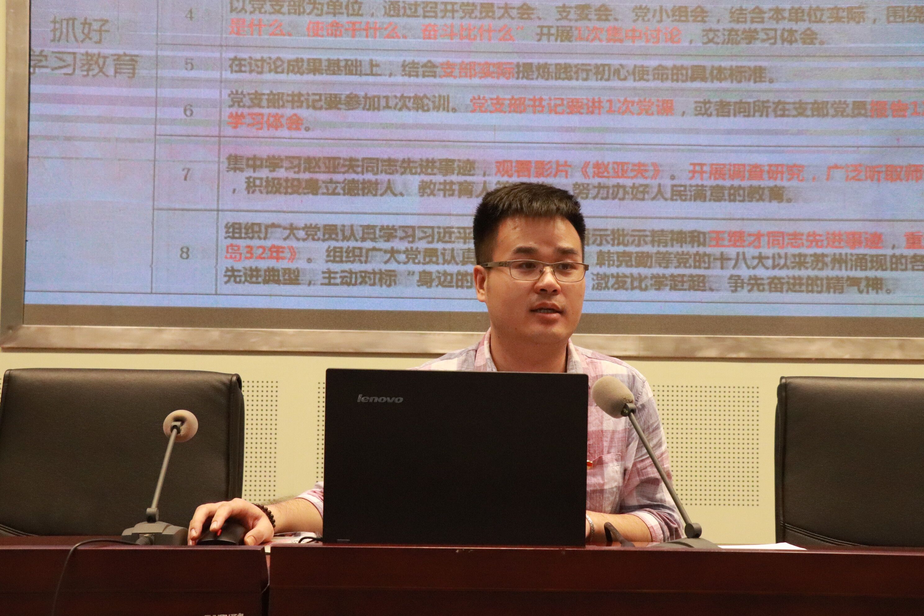 会议第一项议程是组织人事处潘伟斌副处长就学校《不忘初心、牢记使命”主题教育实施方案》》进行了解读,潘伟斌副处长结合“四聚焦、四贯穿”,对支部及党员在主题教育中需要完成的“抓好学习教育”“认真检视整改”中的开展主题党日、学习相关文件及书籍、开展集中讨论、开展“四重四亮“活动、开展志愿服务活动等进行了全面的梳理。