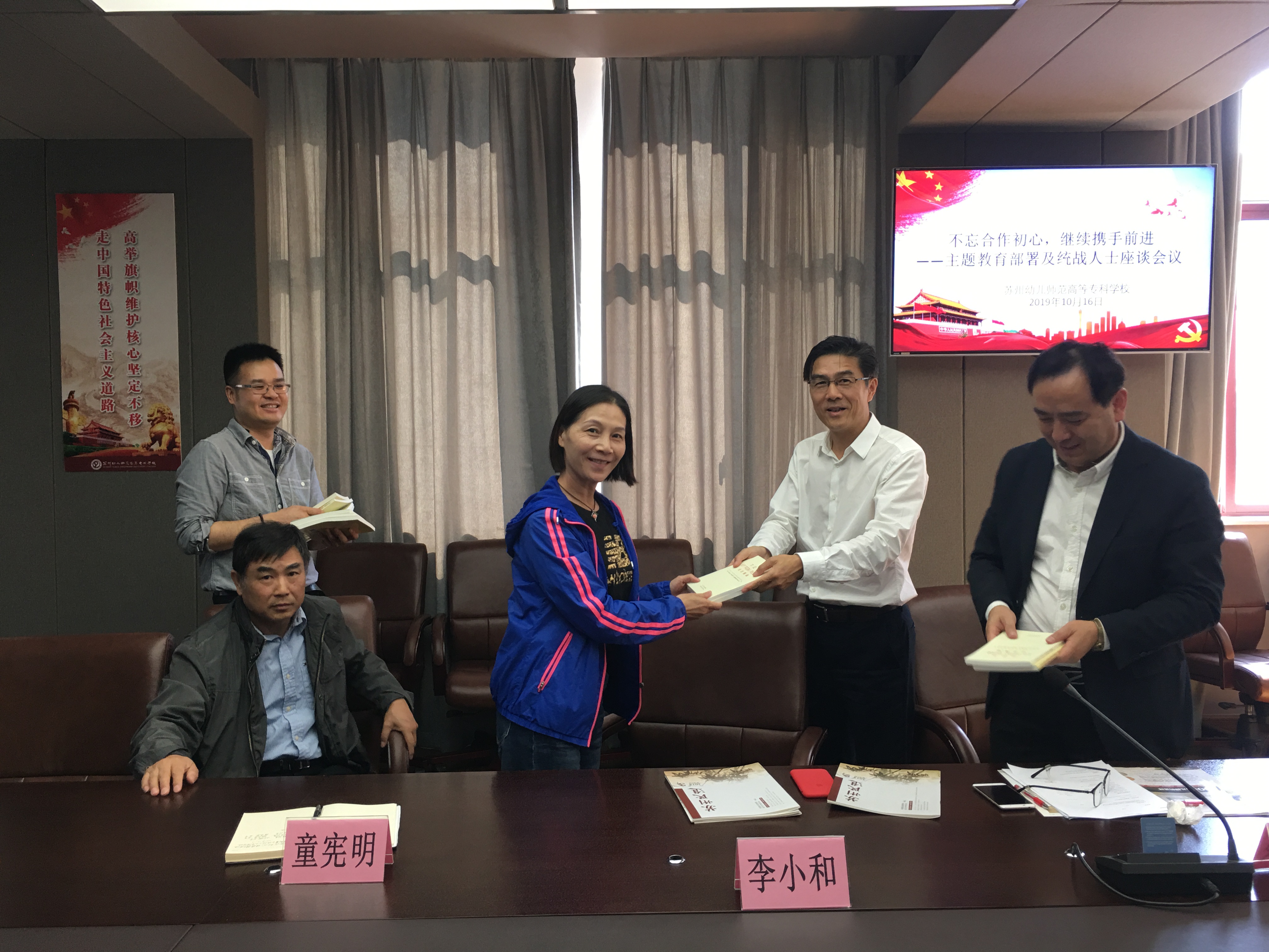 第二项议程由杨建良校长向统战人士赠阅《习近平新时代中国特色社会主义思想学习纲要》和《习近平关于“不忘初心牢记使命”论述摘编》,并鼓励大家多读书多学习,把握新思路领会新高度。