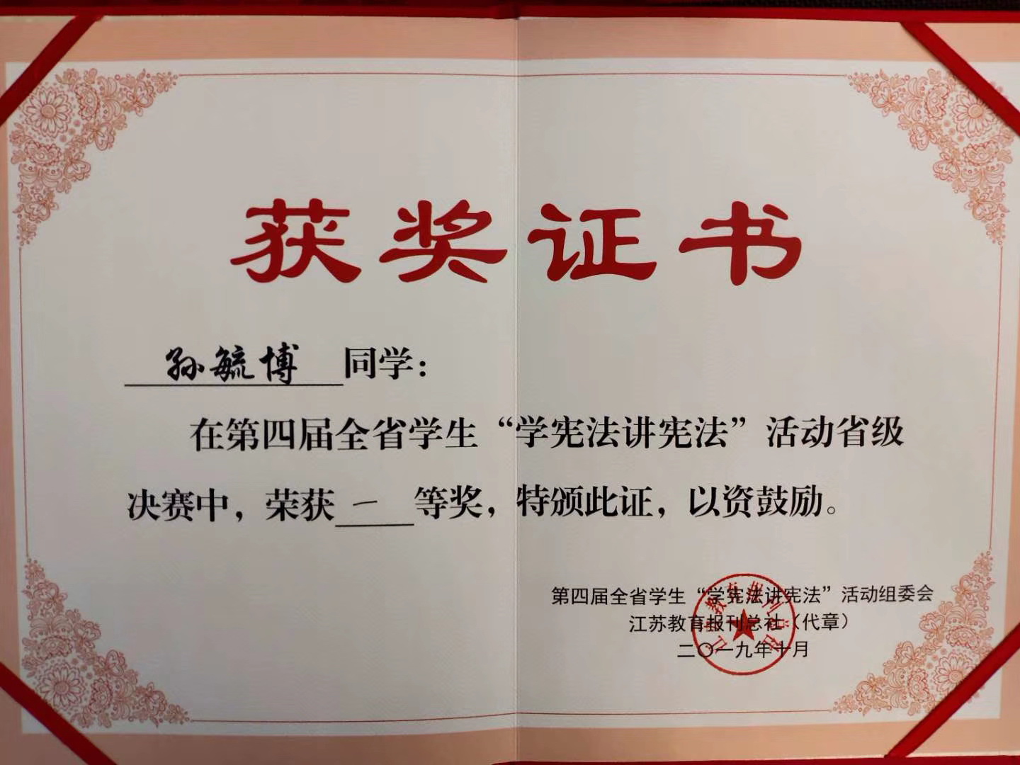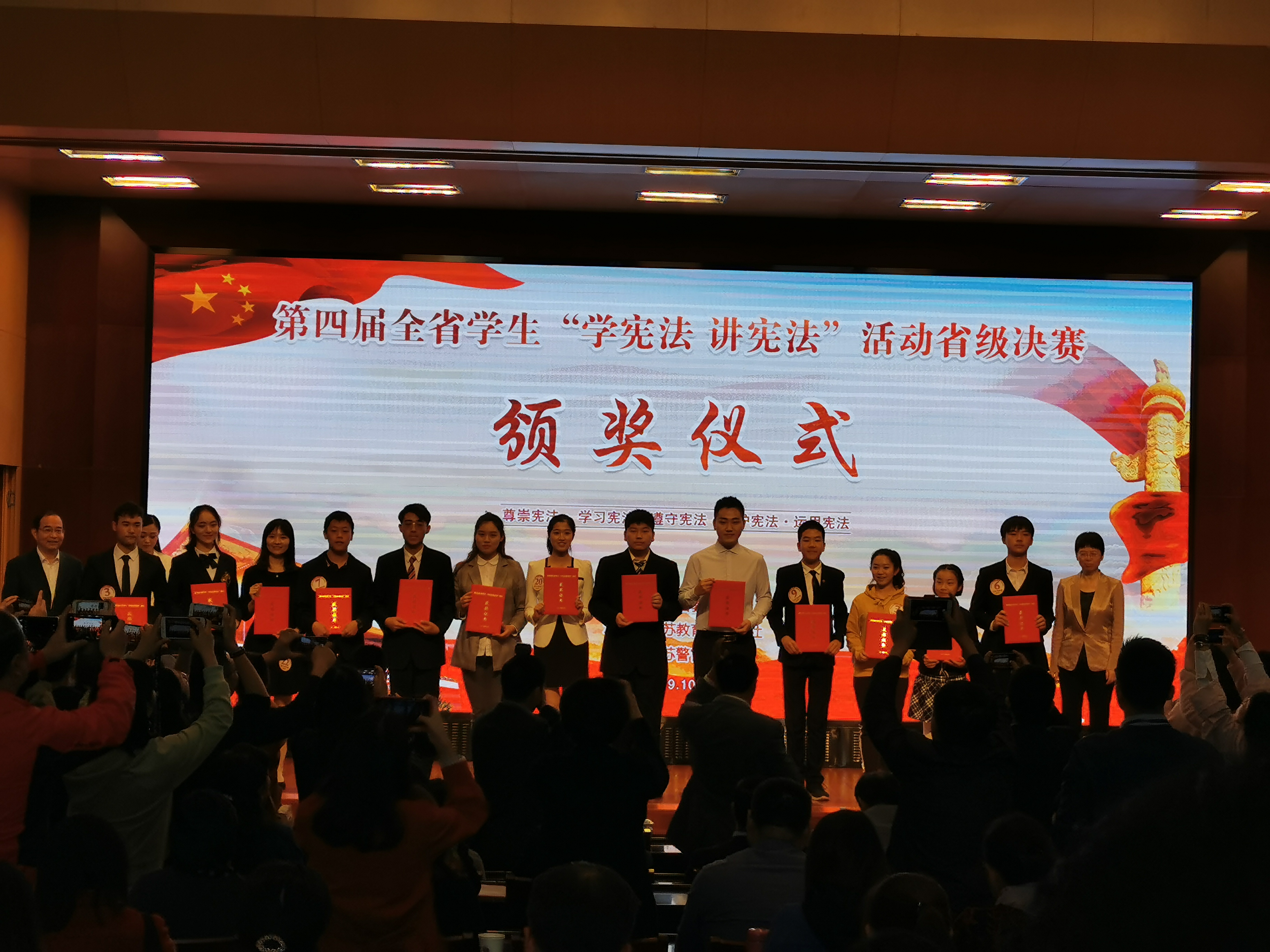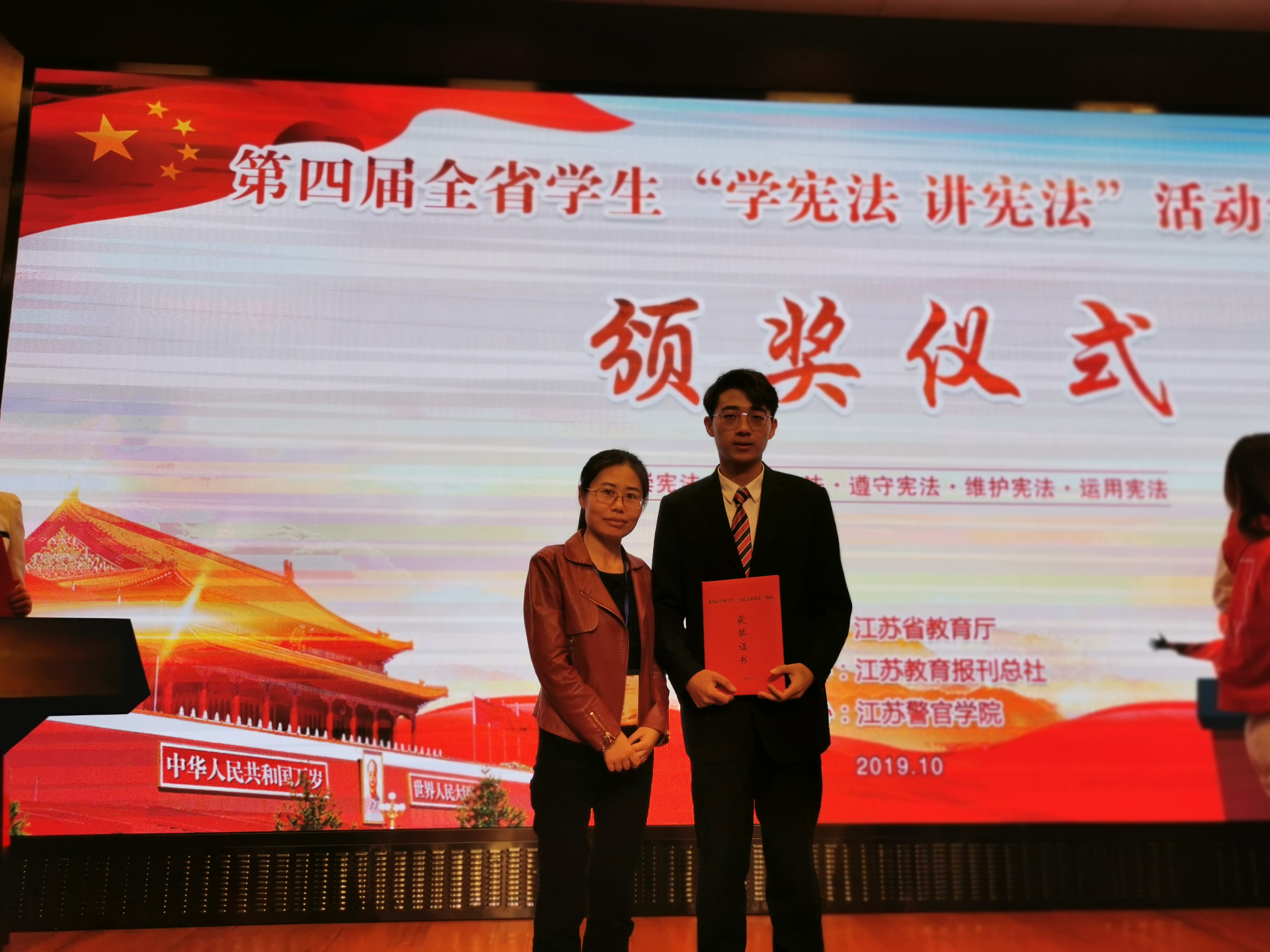 我校学生参加“学宪法 讲宪法”省级决赛获一等奖 时间:2019-10-29 21:10:21 来源:组织人事处 作者:组织人事处 浏览:次 分享到: 10月26日-27日,由省教育厅主办、江苏教育报刊总社承办的第四届全省学生“学宪法 讲宪法”活动省级决赛在江苏警官学院举行。我校学前一系16级学生孙毓博作为苏锡常镇通片代表参加此次比赛,比赛分主题演讲和命题演讲两场,我校师生积极准备,全力以赴,经过现场激烈角逐,最终取得省一等奖的好成绩。 打印正文 关闭本页