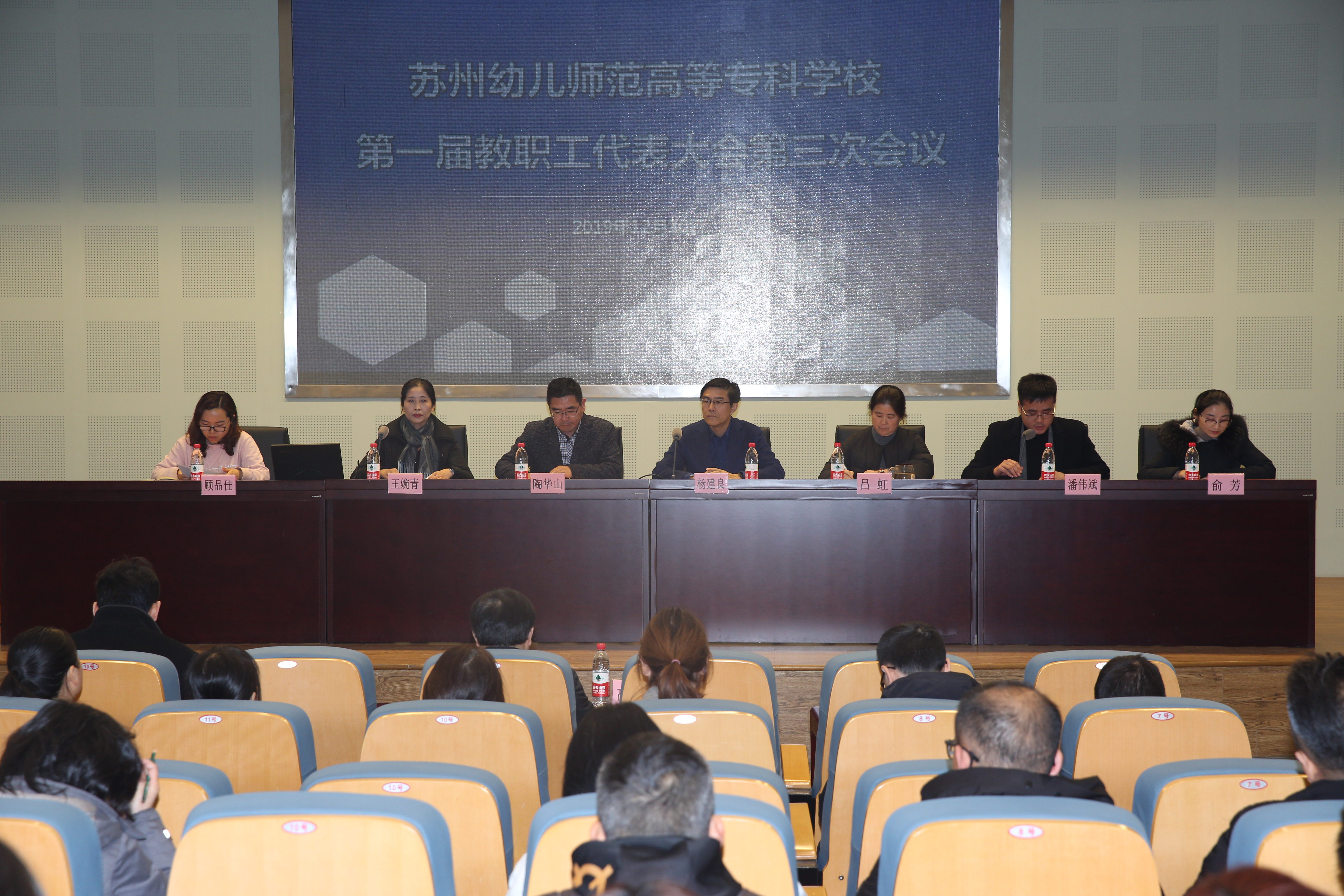 12月30日下午,我校第一届教职工代表大会第三次会议在校报告厅举行,苏州市教育局正处职干部高国华、苏州市教育局宣传与信息处处长赵鸣、我校教代会代表、全体党员、中层干部及退休教工代表出席了大会。会议由工会副主席王婉青主持。