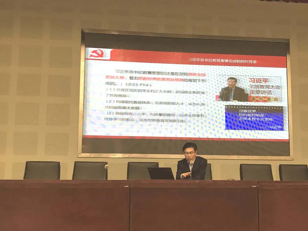 首先,杨校长从“世界正经历百年未有之大变局,新冠肺炎更改变了世界格局”“构建现代教育体系,培养创新型人才,成为人类共同面临重大难题”“确保包容、公平、有质量的教育,促进全民享有终身学习的机会,成为世界教育发展新目标”三个方面,全面论证了习近平总书记教育重要论述是在深刻洞悉全球发展大势,着力把握世界教育发展格局的背景下形成的,从理论层面,带领全体教职员工了解了习近平总书记教育重要论述的时代背景。
