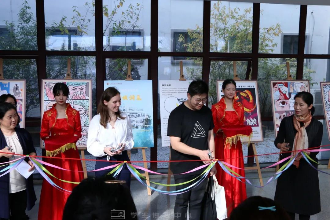 伴随着同学们的倒数声,尤利娅博士、马瀚翔先生与我校吕虹副校长、艺术系王婉青主任一同为此次画展开幕式剪彩。