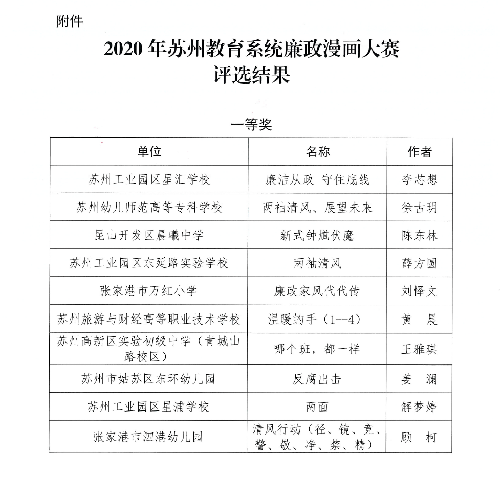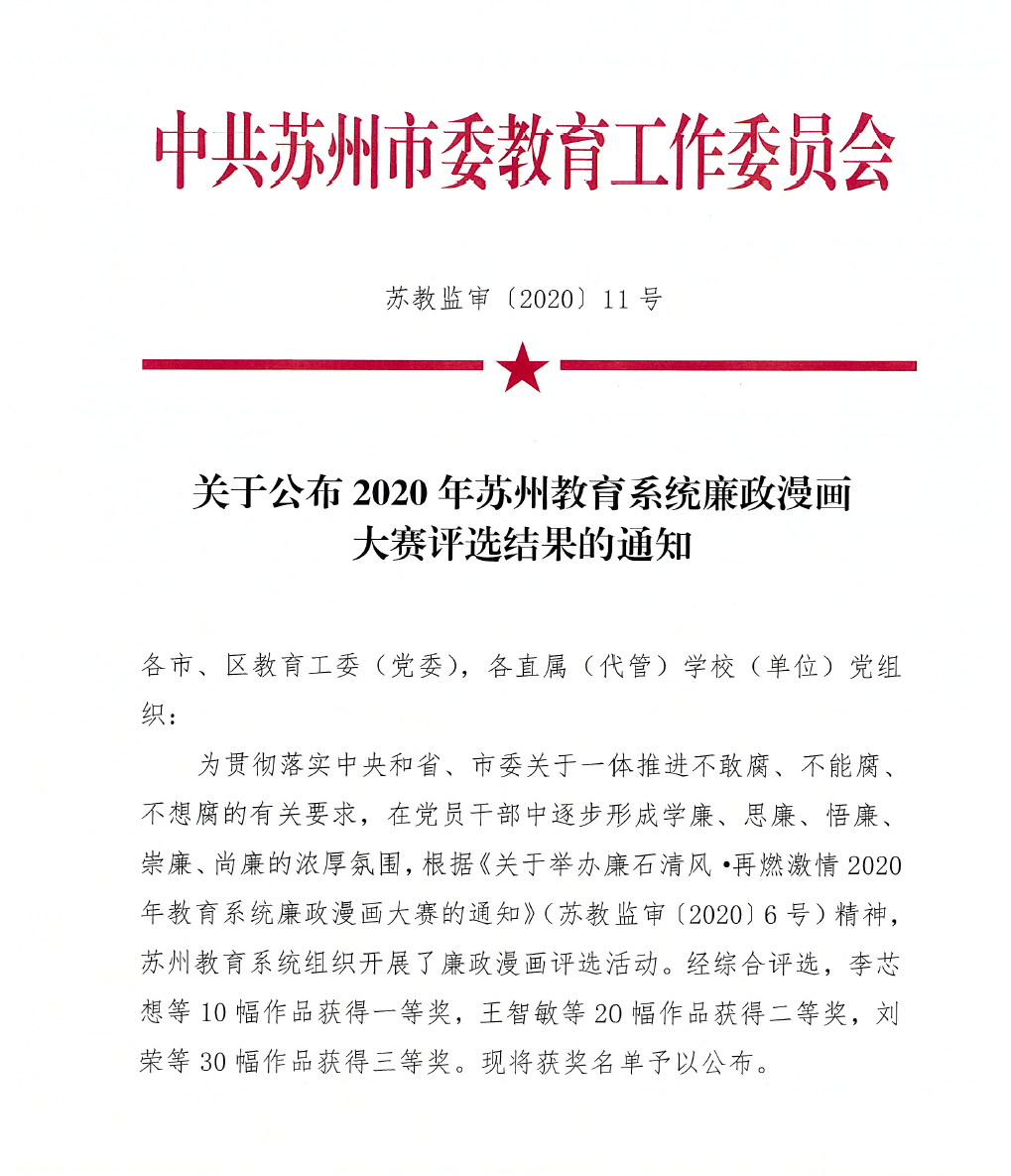 近日,苏州市教育局办公室印发《关于公布2020年苏州教育系统廉政漫画大赛评选结果的通知》(苏教监审〔2020〕11号),我校徐古玥同学的参赛作品《两袖清风、展望未来》荣获一等奖。