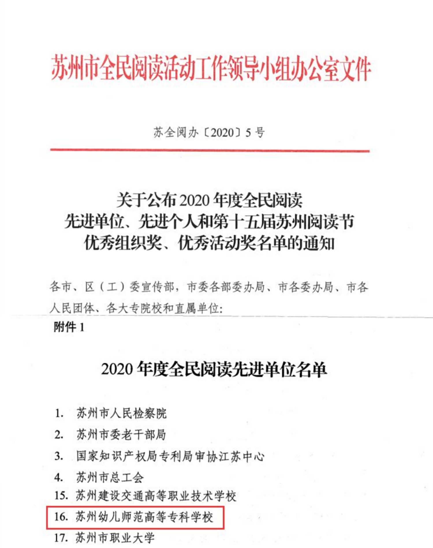 近日,苏州市全民阅读活动工作领导小组办公室印发《关于公布2020年度全民阅读先进单位、先进个人和第十五届苏州阅读节优秀组织奖、优秀活动奖名单的通知》,我校荣获“全民阅读先进单位”荣誉称号。