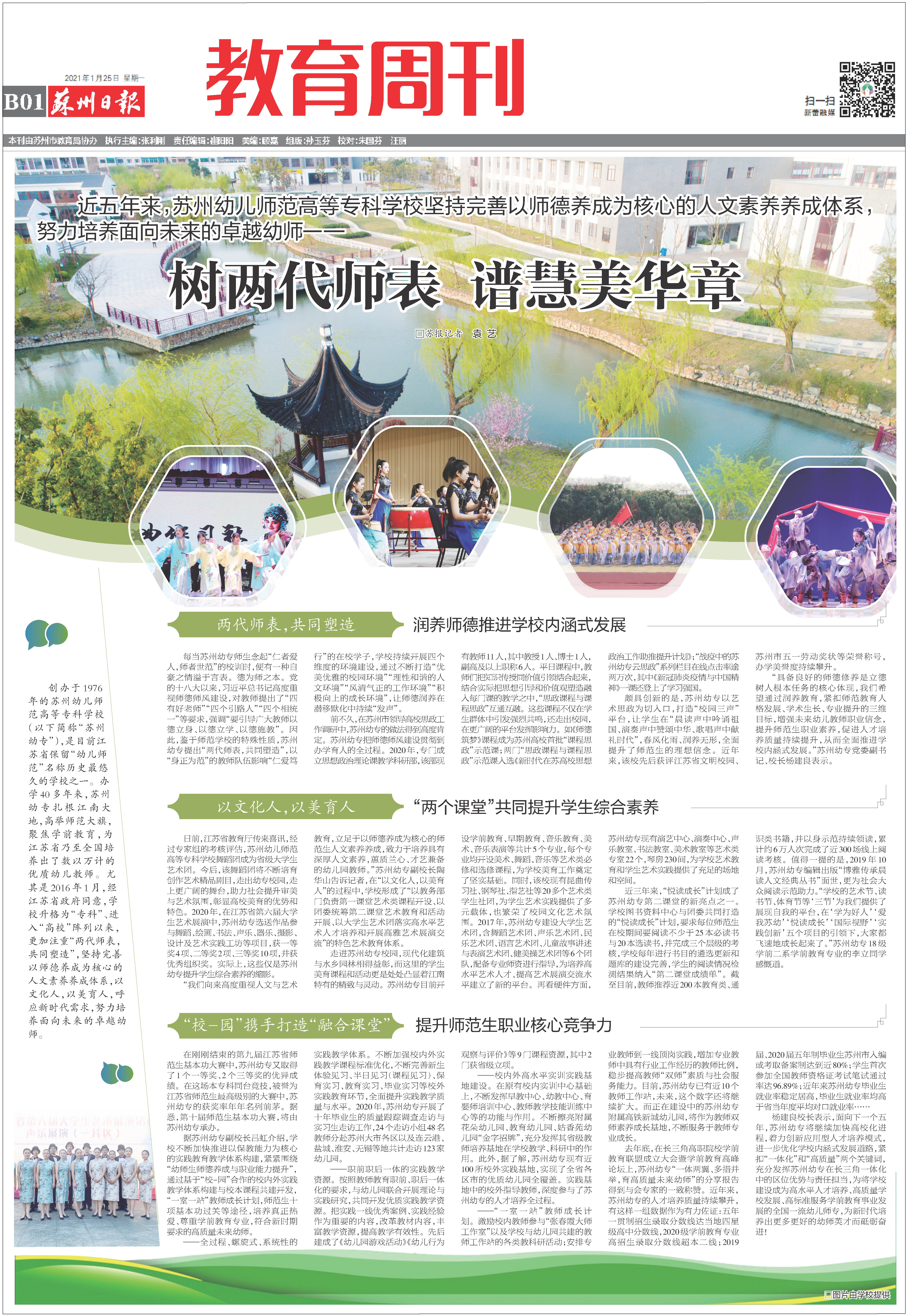 2021年1月25日,《苏州日报》B01版教育周刊栏目以《树两代师表 谱慧美华章》为题,整版报道了近五年来,苏州幼专坚持完善以师德养成为核心的人文素养养成体系,努力培养面向未来的卓越幼师。全文如下: