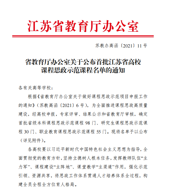 近日,省教育厅发布了《关于公布首批江苏省高校课程思政示范课程名单的通知》(苏教办高函〔2021〕11 号),经高校申报,专家评审、结果公示和省教育厅审核,确定首批省级本科课程思政示范课程98门、研究生课程思政示范课程30门、职业教育课程思政示范课程55门,我校《师德筑梦》课程成功入选省首批职业教育课程思政示范课程。