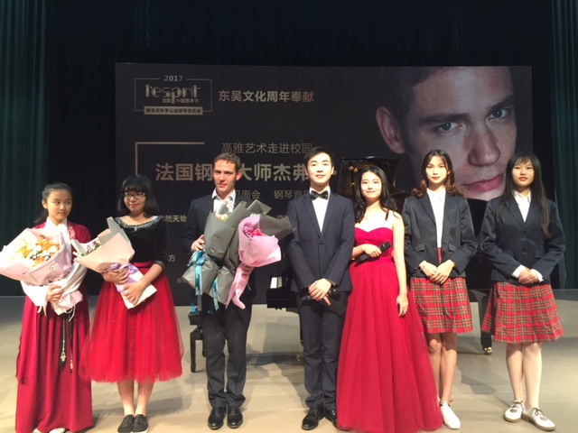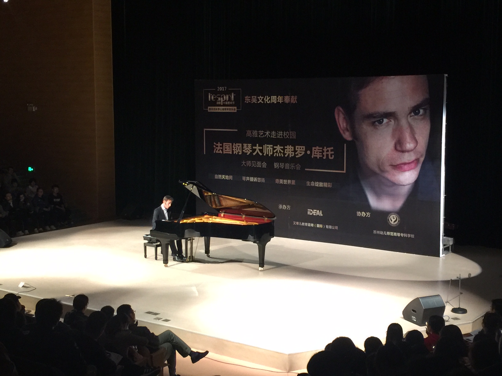 On Sunday afternoon, French pianist Geoffroy Couteau came to our campus to meet with our students and teachers from the Department of Arts. Mr. Geoffroy Couteau was awarded the first prize in the International Johannes Brahms competition in 2005. His first recording of Brahms’s final works earned him a number of honors. He has been invited to play in various festivals, like the “Piano aux Jacobins” Festival in Toulouse, the Chopin Festival in Bagatelle, the Chopin Festival in Nohant, the Lilles Piano Festival, the New Soloist Festival at the Serres d’Auteuil, the Epau Festival, the “French May” in Hong-Kong, etc. In 2002, he obtained the conservatory’s diploma of advanced formation with highest honors and with the special Daniel Magne award. He studied chamber music with Jean Mouillère and Christian Ivaldi. He has participated in a number of master classes from famous musicians such as Dmitri Bashkirov, Christoph Eschenbach, and Leon Fleisher. In the meeting, he communicated with our students and teachers on his experience of playing the piano and shared some play skills by presenting demonstration for all the audience. In the evening, about 450 students, teachers and piano amateurs watched his performance in our concert hall. His romantic and passionate performance was highly favored by the audiences and piano lovers. The event was organized by French L’esprit China Art Festival and Dongwu Arts Research & Cultural Exchange Center. It was also a good try for our school to participate in such an international activity. It benefits our students and their artistic horizon.