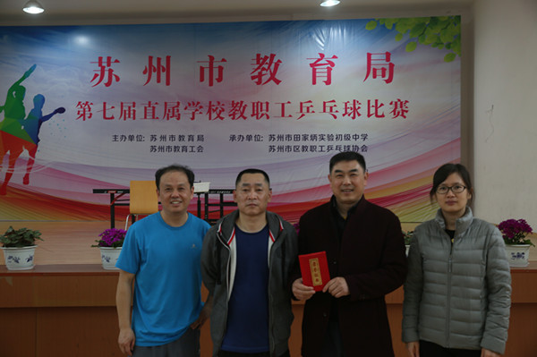 4月9日,苏州市教育局第七届直属学校教职工乒乓球比赛如期在苏州市田家炳实验初级中学开赛。比赛只设混合团体赛,刘春一、朱虹、童宪明、王琳四位老师代表我校参加比赛,经过一天紧张激烈的战斗,我校喜获团体亚军。