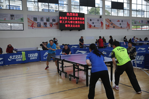 上午八点整,简短的开幕式之后,比赛正式开始。在上午第一阶段的小组循环赛中,我校与四中和平江中学一组,由于对方和我们实力差距较大,我们以小组第一的身份顺利进入第二阶段的淘汰赛。在下午十六进八和八进四的比赛中,我校运动员齐心协力、稳扎稳打,顺利战胜旅游财经与教育工会代表队。比赛自半决赛开始变得紧张激烈起来,半决赛中的对手是苏高职代表队,他们的实力不容小觑。比赛中我们精诚团结,认真对待每一个球,最终我们3:1赢得苏高职进入决赛。最紧张、最激动人心的是在决赛,对方是我们在决赛中的老对手、去年团体冠军——技师学院代表队。决赛第一场比赛刘春一老师以2:1强势拿下,但接下来的三场比赛遗憾输给对方,最终我校教职工代表队1:3不敌技师学院,获得了本届乒乓球比赛团体亚军。