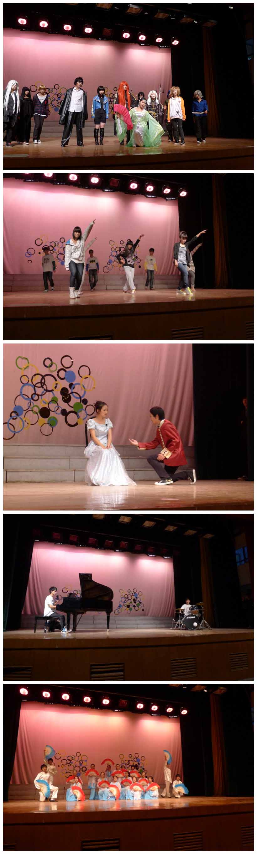 随着魔法英语社《What I want to be》动感欢快的歌声响起,演出拉开了帷幕。紧随其后的由动漫社带来的COSPLAY秀很快掀起了一个小高潮。朗诵社的诗歌朗诵《昨天、今天、明天》生动的展现了青年人的成长成熟的心路历程。话剧社表演了经典剧《灰姑娘》,全新的演绎方式赢得台下的阵阵笑声。魔法英语社的两个男生以钢琴弹唱和架子鼓的形式表演了歌曲《You are my sunshine》带来了一股清新之风。当晚,街舞社带来的劲歌热舞,把全场气氛点燃,台下观众的欢呼声一浪高过一浪。最后,在场观众被在舞剧社《仙剑奇缘》高超的舞技表演所折服,整台演出也落下了帷幕。
