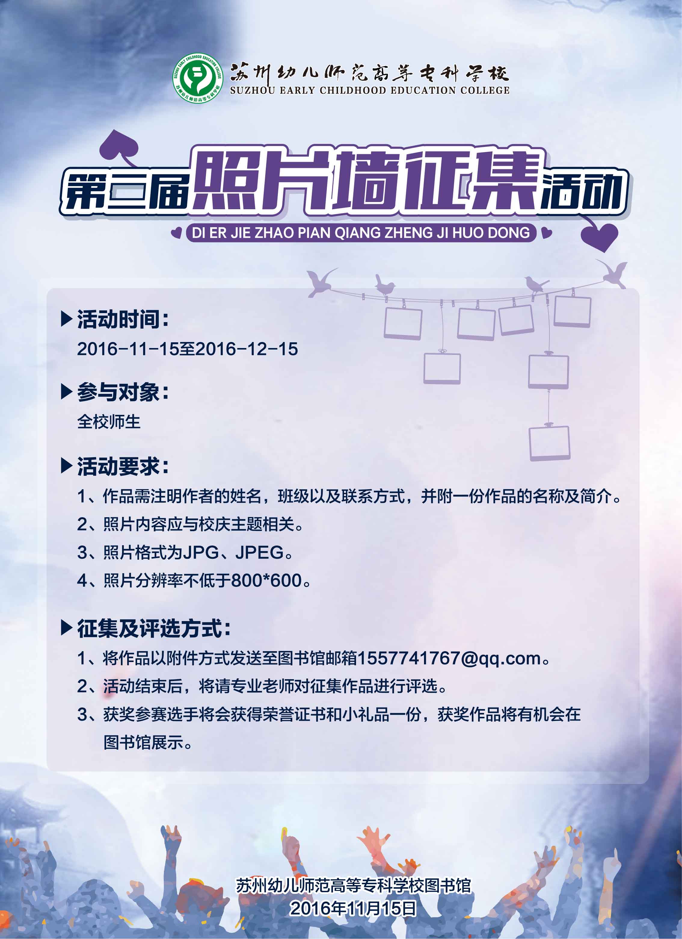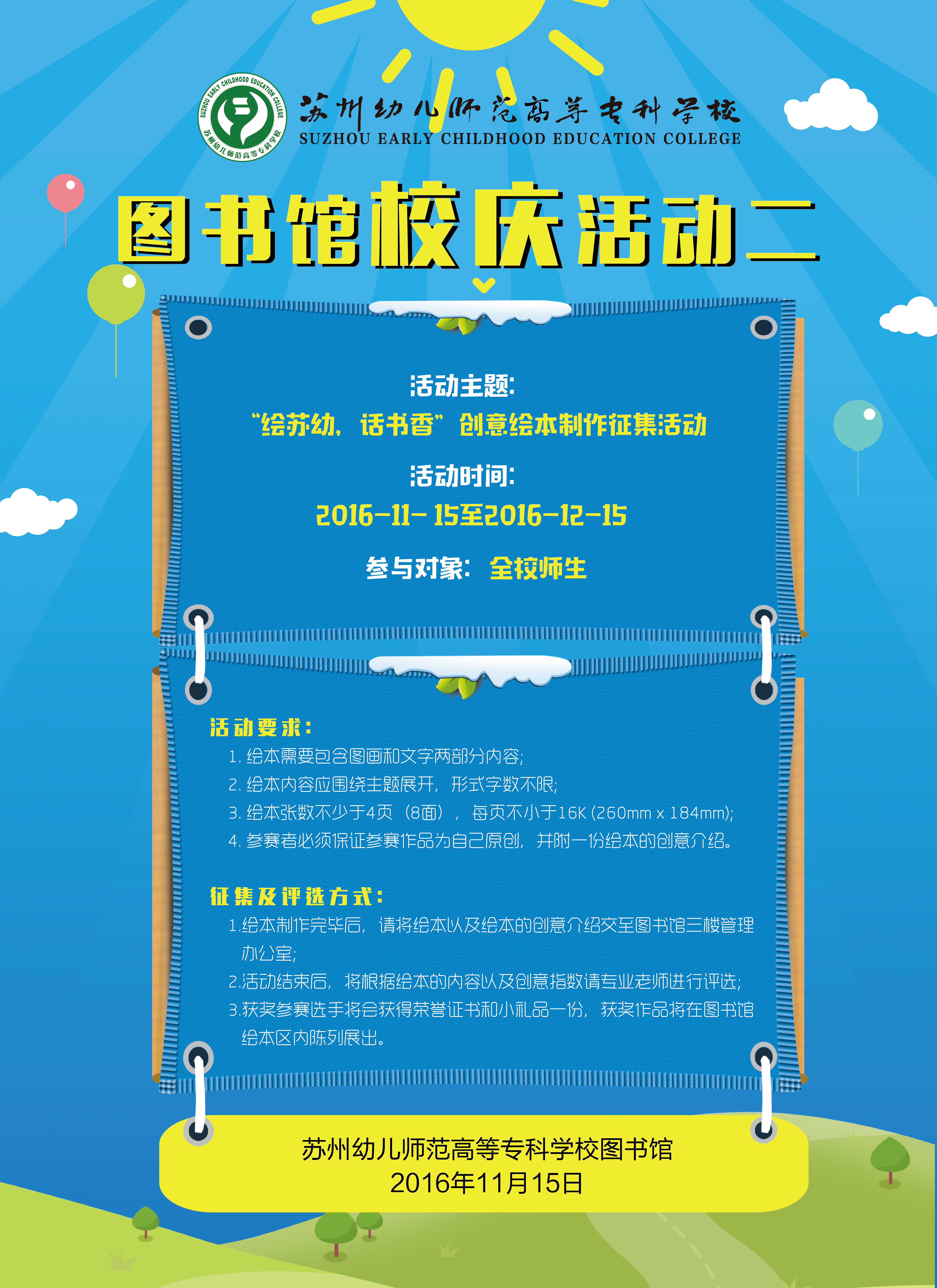 图书馆校庆征集活动 来源:本站原创 发布时间:2016-11-22 09:07:47 浏览次数: 次 【字体:小 大】 时值我校四十周年校庆,为了彰显我校人文风采,激发师生们的爱校热情,图书馆现面向全校师生开展校庆征集活动。 活动一:第二届照片墙征集活动 活动二:“绘苏幼,话书香”创意绘本制作征集活动 分享到: 【打印正文】