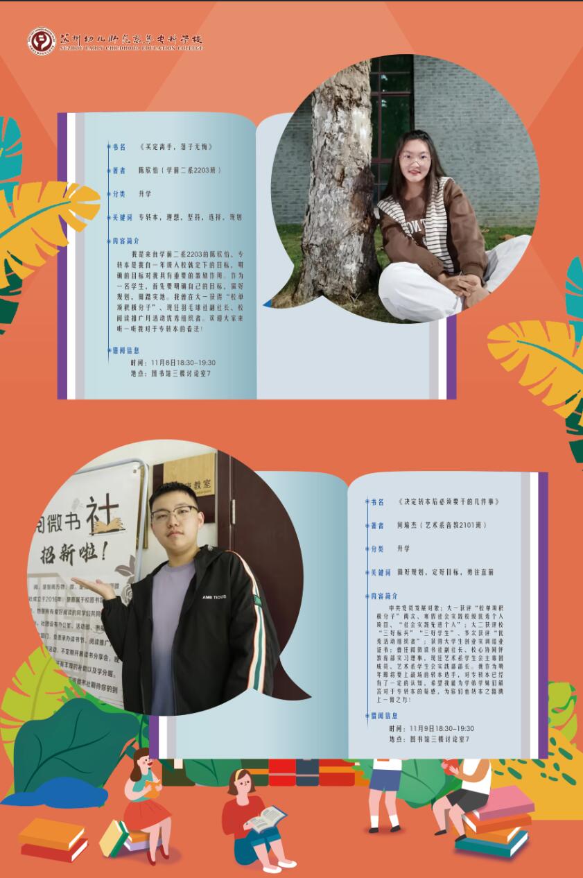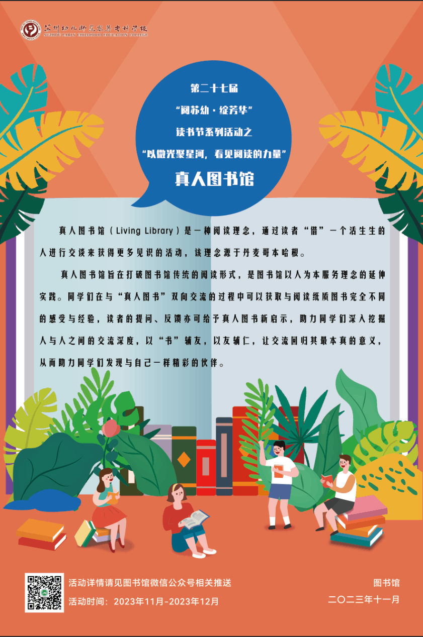 截至目前,图书馆已征集到“真人图书”计13“册”,主题内容涵盖职业发展与个人成长、专转本经验交流、心理健康、时间管理、形象管理、社会实践、艺术鉴赏、班干部自我成长、教师资格证考试备考、技能课学习经验分享等;“真人图书”将于11-12月在校内进行线下交流;自本周起,每周开展2-3“册”图书的借阅活动;请同学们密切关注图书馆公众号与PU平台获知具体借阅的时间、地点及人数。