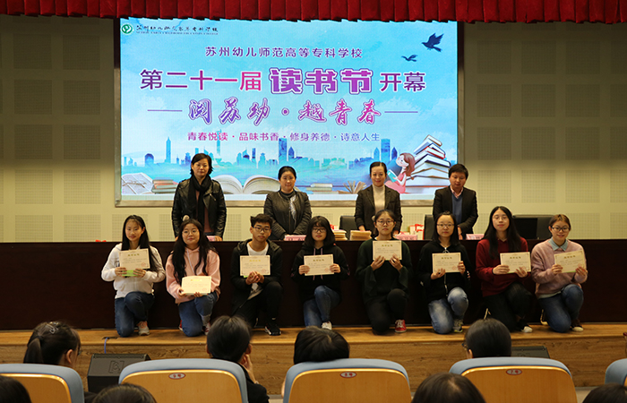 11月15日,以“阅苏幼·越青春”为主题的我校第二十一届读书节开幕式在阅微楼报告厅隆重举行。副校长吕虹、学工处主任肖蕾、图书馆馆长张卫平、校团委书记周慧明及图书馆员,学前1系、学前2系与艺术系各班的班长、三好标兵、三好学生、优秀学生干部以及班级图书管理员、2016-2017学年优秀读者、学前1系2017级部分新生等共计200余人参加了开幕式。开幕式由张卫平馆长主持。