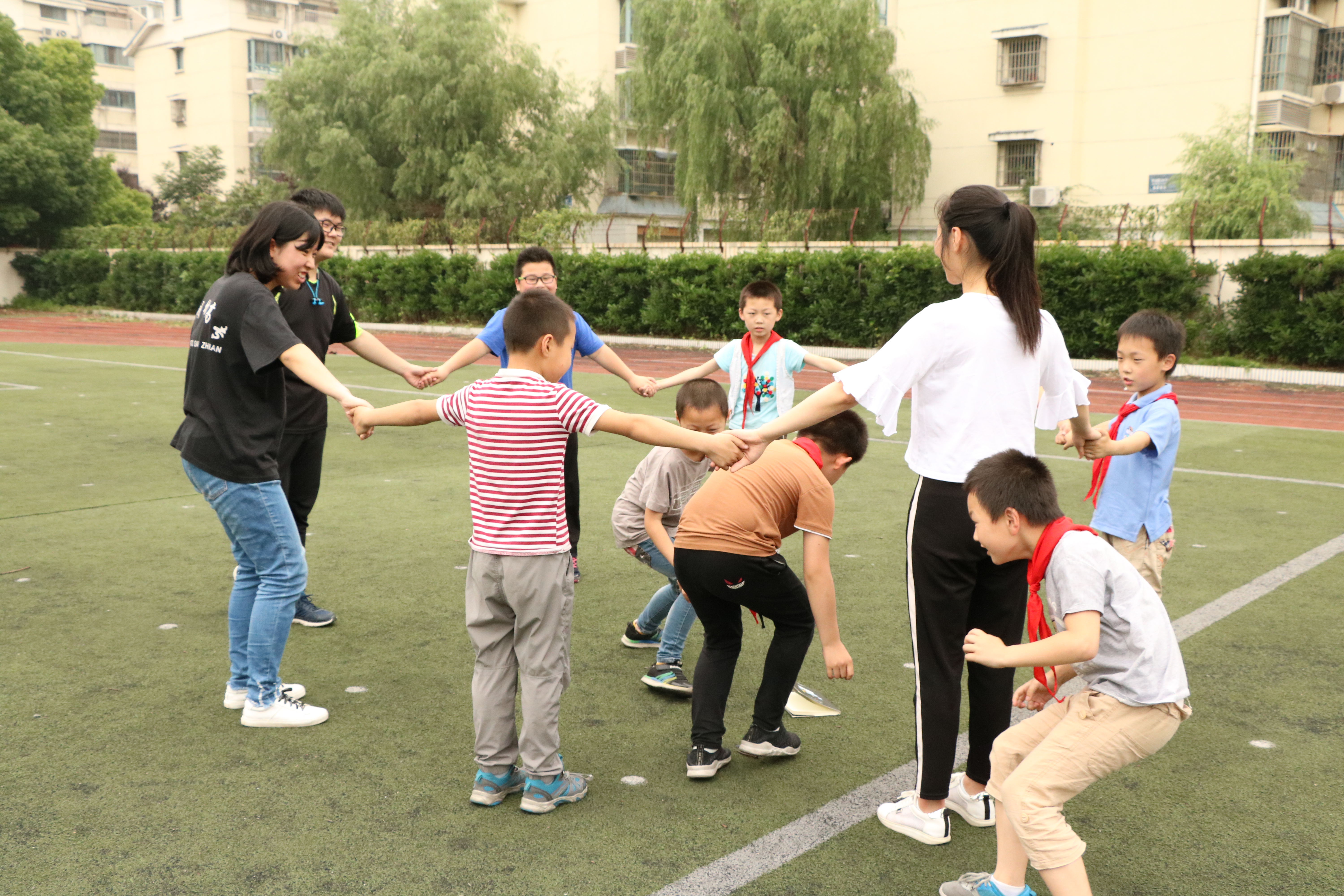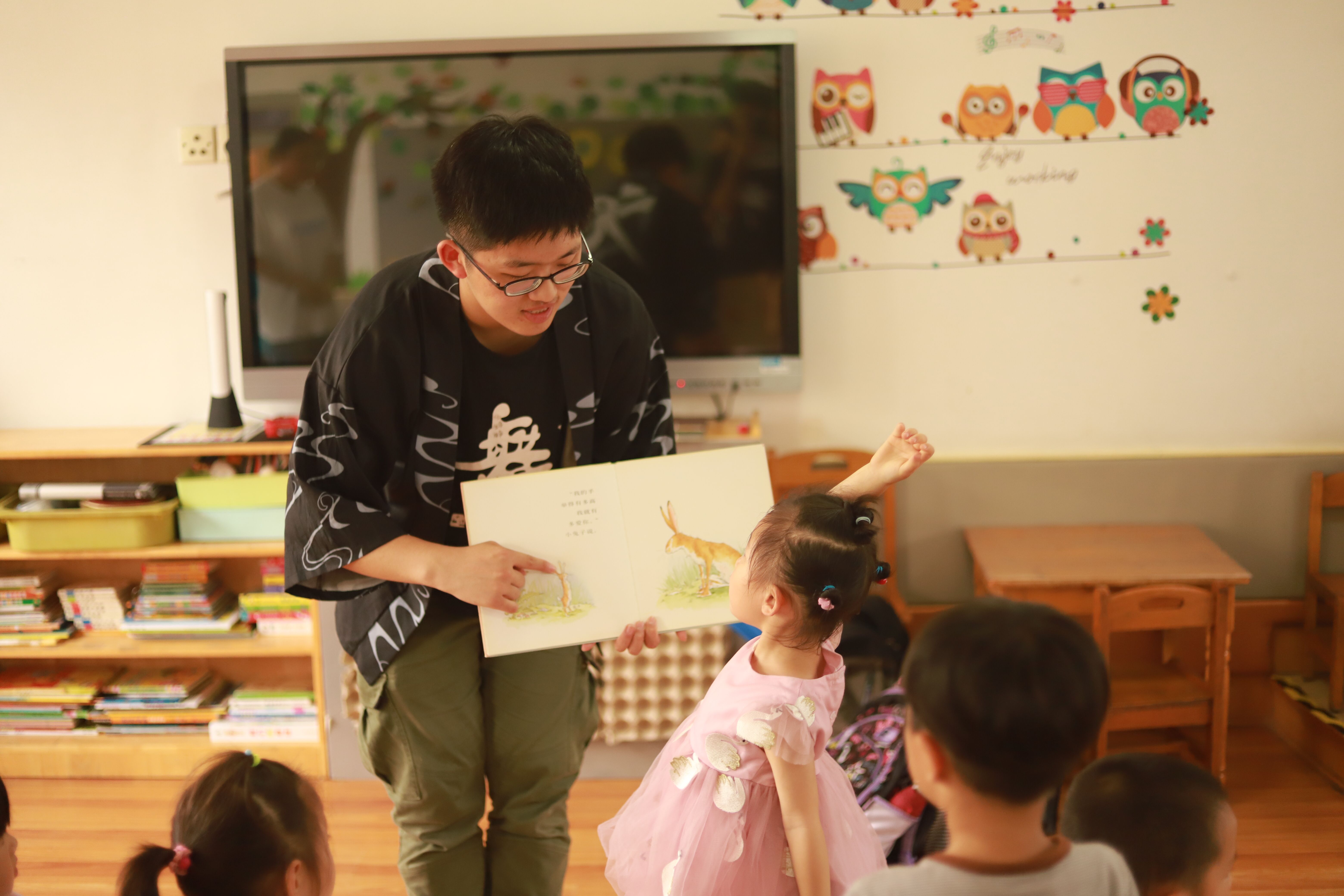 活动的第二个部分在姑香苑幼儿园进行。来到幼儿园时,刚好是孩子们午睡起床后的时间。社员分七组进入各个班级,跟着带班老师陪孩子们在教室吃点心、玩游戏,先和孩子们熟悉起来。游戏之后,是户外运动时间。社员也和小朋友一起,跟着鼓点舞动了起来,连空气都充满了活力。