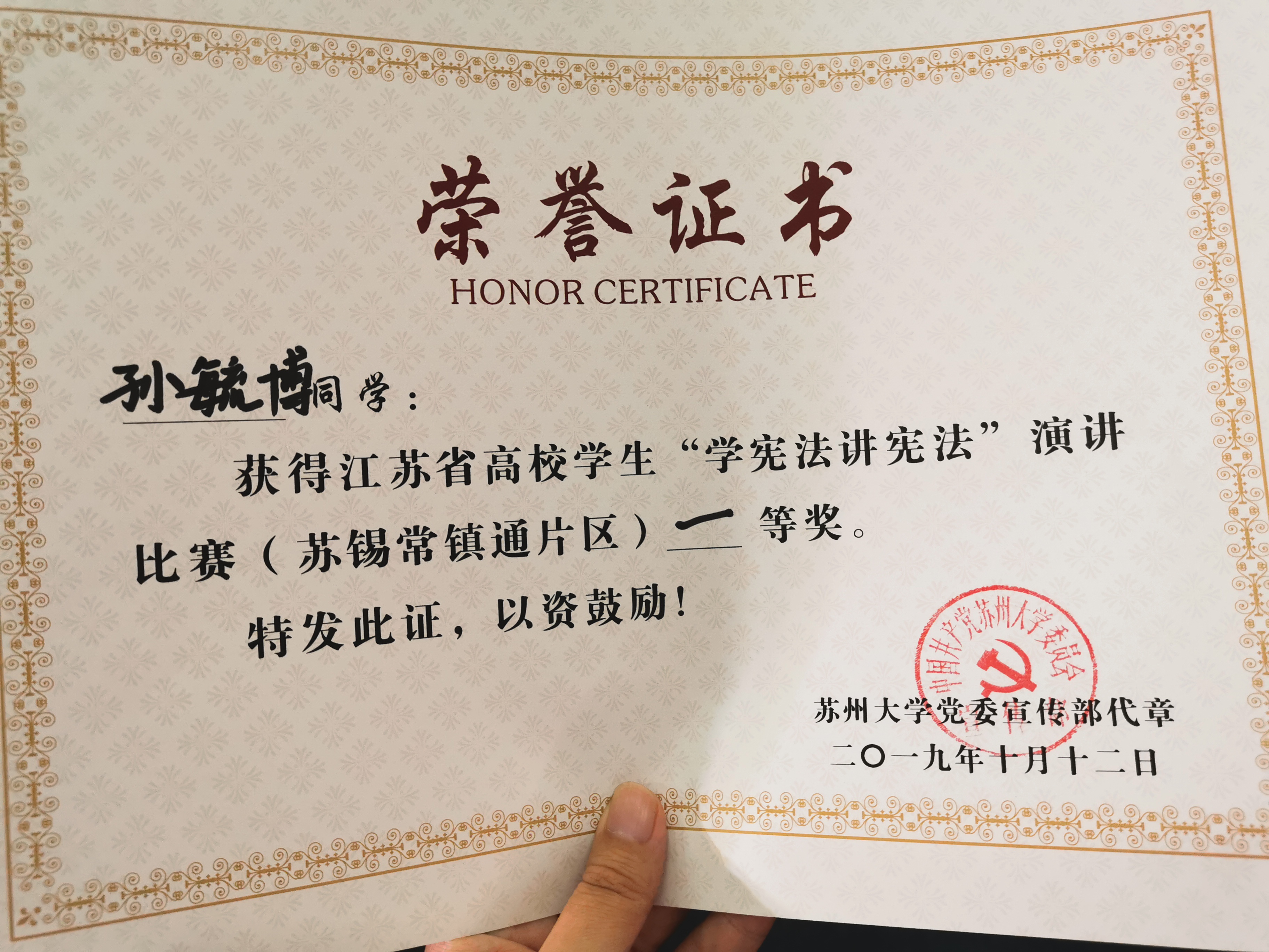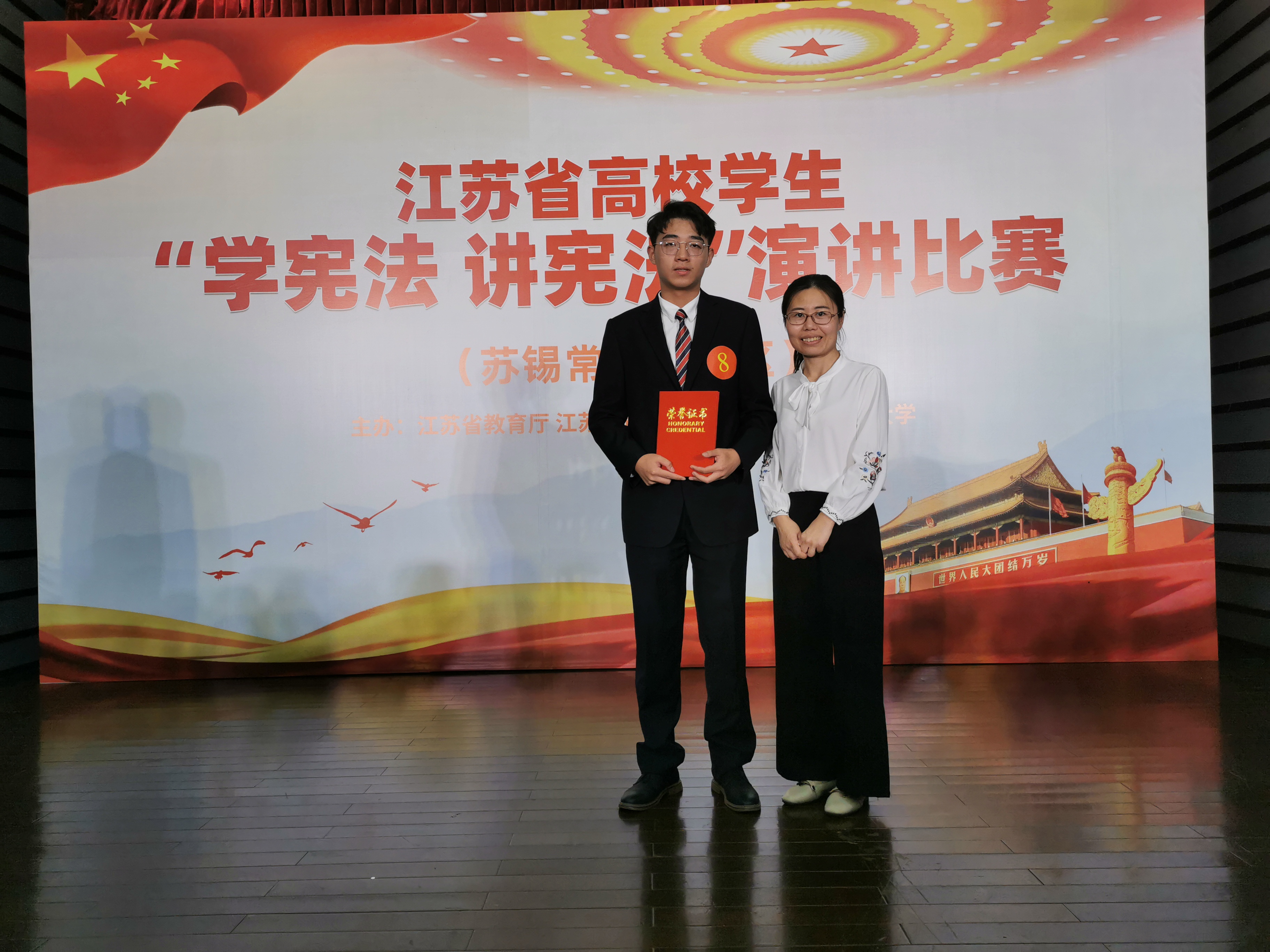 第一轮主题演讲中,各高校参赛选手竞争激烈。我校同学作了《传承宪法精神 弘扬时代师风—致敬教育工作者》的演讲在第一轮中表现优异,排名第三。第二轮是命题演讲,所选试题均为法学专业知识,我校师生认真备赛。最终,我校孙毓博同学荣获江苏省高校学生“学宪法 讲宪法”演讲比赛(苏锡常镇通片区)一等奖,并代表该片区参加江苏省决赛。